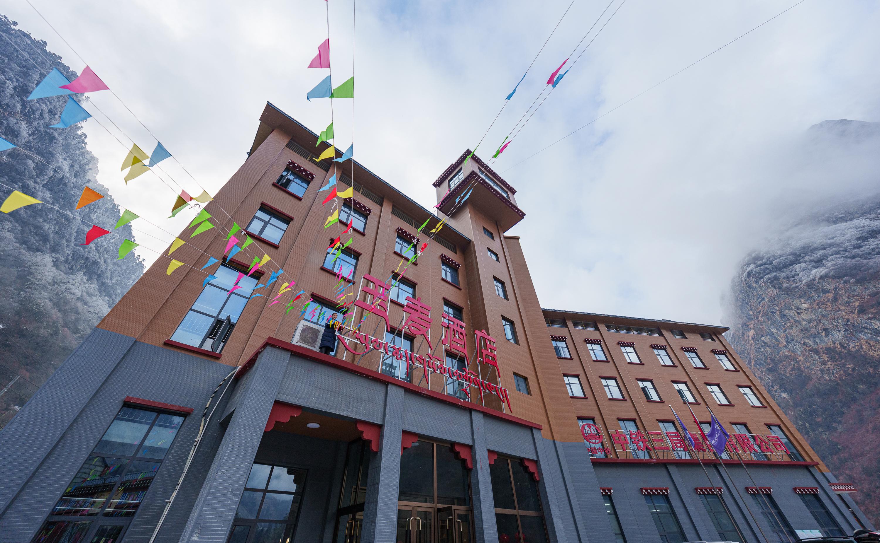 2月5日,玉麥酒店員工掛彩旗迎接即將到來的春節(jié)和藏歷新年。新華社記者 丁增尼達 攝