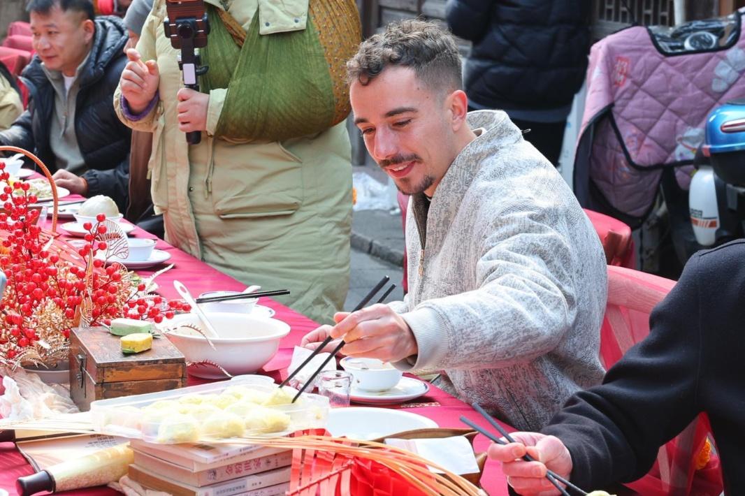 來自法國(guó)的Loann表示:“第一次參加長(zhǎng)桌宴很新奇,第一次吃松花湯團(tuán)很特別,慈溪的鄉(xiāng)村生活很好。”99歲的山下村村民虞靜玉在兒媳婦的陪伴下也來到了現(xiàn)場(chǎng),非常感慨:“交關(guān)好,讓我想起早些年的春節(jié),也像現(xiàn)在這樣熱鬧,最好每年都能這樣?!庇慰蛡儑L(zhǎng)桌,在熱氣騰騰的品鑒中溯源山海本味,在歡聲笑語(yǔ)里感受鄉(xiāng)村團(tuán)圓宴的溫暖氛圍。長(zhǎng)桌宴不僅是一場(chǎng)味覺盛宴,更成為連接情感、傳遞年味的生動(dòng)場(chǎng)景。