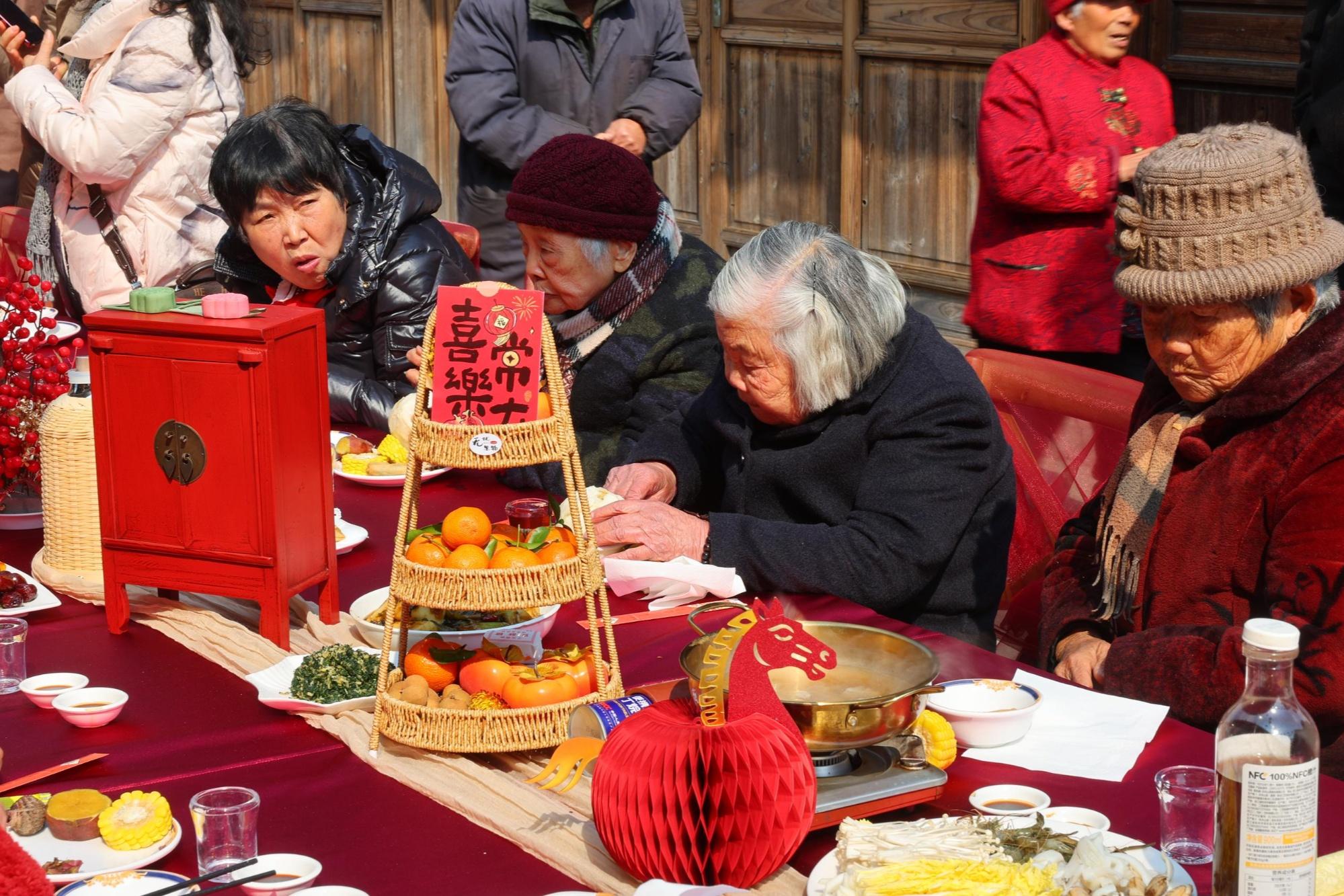 整場(chǎng)活動(dòng)以“五?!崩砟顬槊}絡(luò),巧妙融入徐福東渡傳說等本土文化元素,通過紅燈籠、春聯(lián)、仿古布景的視覺營(yíng)造,既展現(xiàn)了龍山獨(dú)特的地域風(fēng)情,又烘托出濃郁傳統(tǒng)的中國(guó)年味。龍山鎮(zhèn)黨委委員韓亦妙表示:“這是我們第一次在新春時(shí)節(jié)舉辦長(zhǎng)桌宴,希望通過這樣的形式為村民送上新年的第一頓團(tuán)圓飯。我們邀請(qǐng)了百歲老人、國(guó)際友人、時(shí)代楷模、各行各業(yè)代表和屬馬的游客共同參與,選取‘慈溪十大碗’等本土菜肴,就是想讓更多人在團(tuán)圓中共品家鄉(xiāng)味、共敘鄉(xiāng)土情?!?/p>