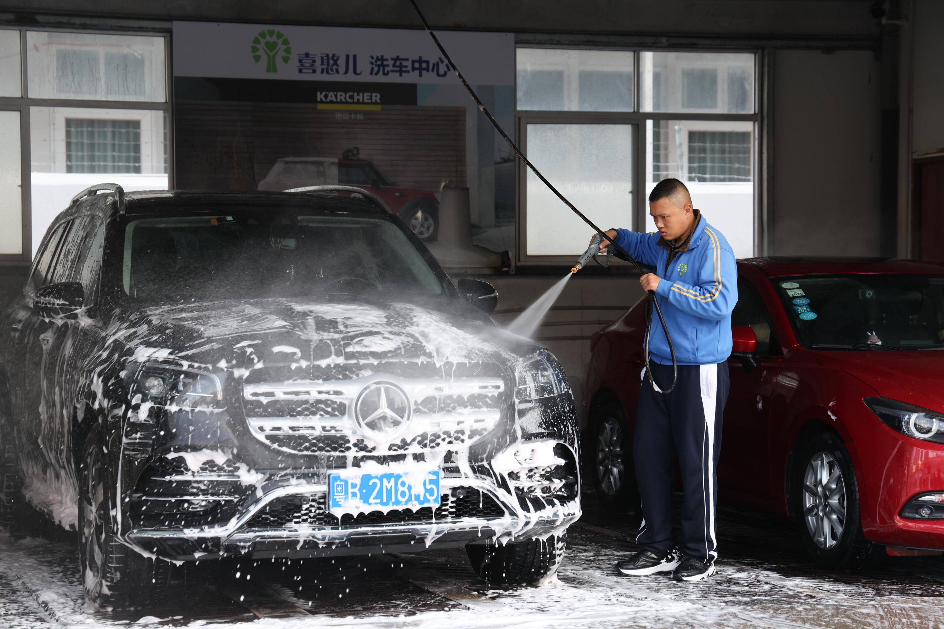 在位于深圳市福田區(qū)的喜憨兒洗車中心,心智障礙青年正在認(rèn)真地清洗車輛(2月11日攝)。新華社記者梁旭 攝