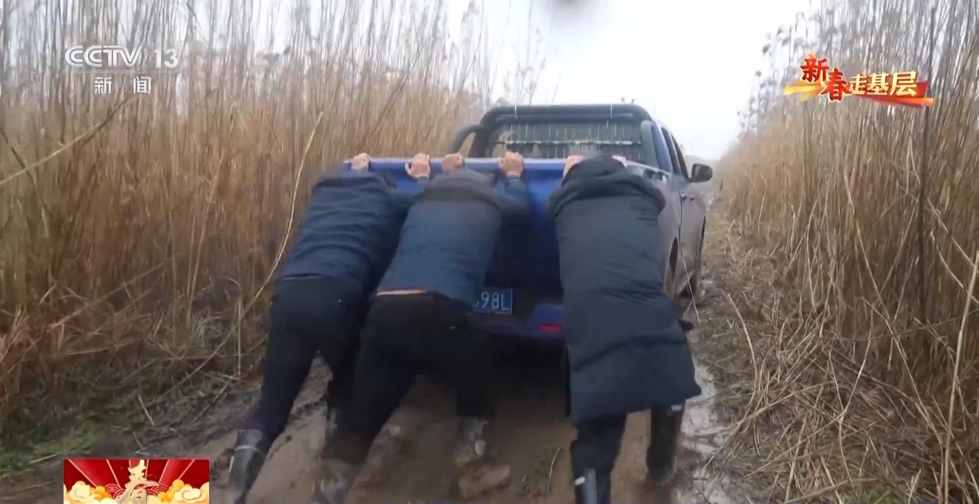 無人機畫面里,一只國家二級保護動物小天鵝被困水中。陳新凱立刻帶隊趕去,可途中的一場雨,把鄉(xiāng)間土路泡成了泥潭,車子陷了進去。