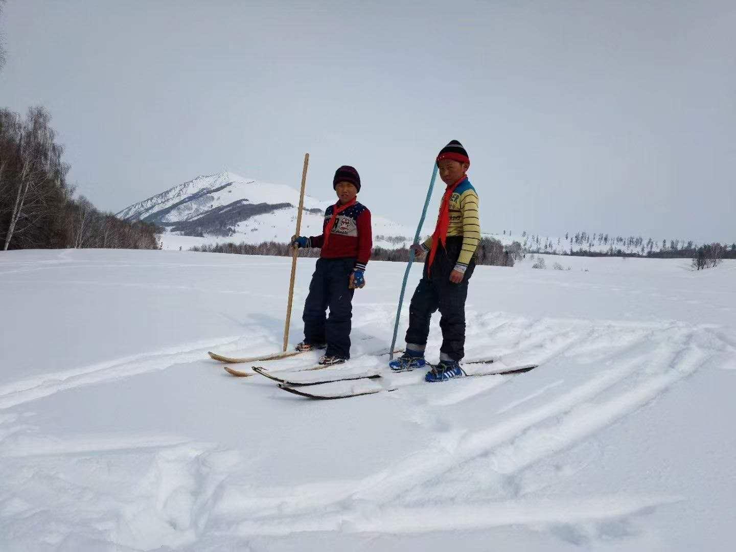 小時(shí)候的布魯爾(右)和小伙伴一起在禾木村用古老毛皮滑雪板滑雪(資料照片)。新華社發(fā)(受訪者家人提供)