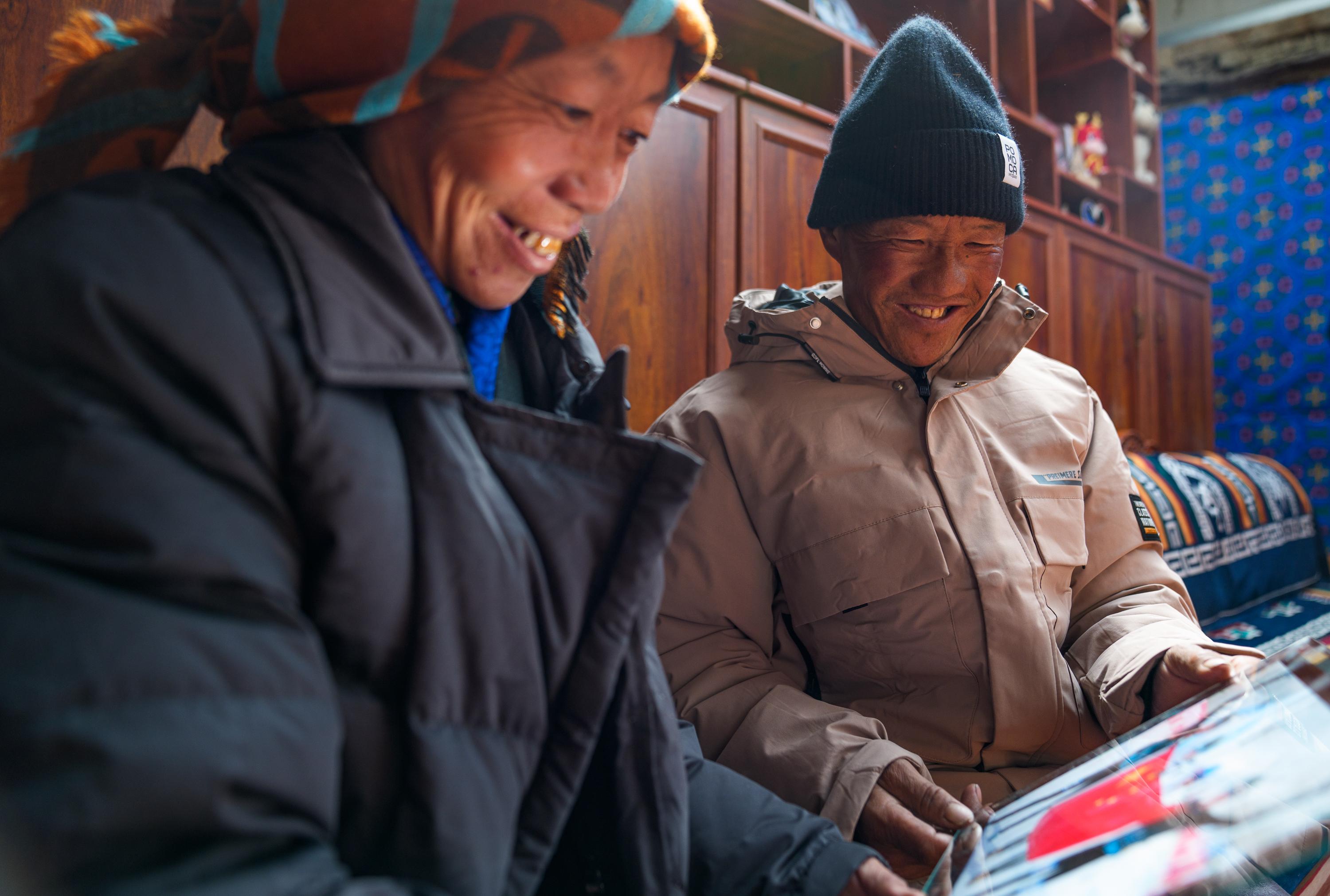 次旦玉珍的父母在家中翻看女兒參賽的照片(2026年2月7日攝)。新華社記者 丁增尼達(dá) 攝