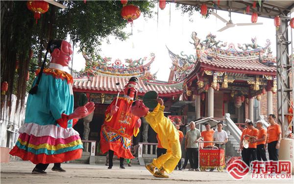 浦南古儺參加廟會表演。李斌 供圖 漳州市薌城區(qū)流傳著一種古老的儺舞形式——浦南古儺,又稱“大神尪”。據(jù)民間傳說,浦南古儺始于唐朝末年,最早是當(dāng)?shù)鼐用裼褓悤?、?qū)逐疫鬼的一種儀式,后來逐漸增加了迎祥祈福、酬神納吉的功能,演變?yōu)閭鹘y(tǒng)的民俗活動。在逢年過節(jié)、重大慶典或民間活動中,都可以看到“大神尪”的表演。2011年5月,浦南古儺入選第三批國家級非物質(zhì)文化遺產(chǎn)擴展項目名錄。 浦南鎮(zhèn)現(xiàn)有兩尊“大神尪”:一尊是七品縣官形象,另一尊是書童形象?!按笊駥丁钡闹谱魇且灾駰l為材料編成鼓形竹筐,外罩繡有精美圖案的服飾。表演時,由舞尪人鉆進尪里用肩膀扛起,戴上面具,“縣官”手握“國泰民安”或“風(fēng)調(diào)雨順”的牌子,“書童”舉著扇子,踩著伴奏鑼鼓的節(jié)奏舞蹈,另有一“大頭娃娃”在他倆之間蹦蹦跳跳?!按笊駥丁钡奈璧竸幼骷瓤鋸堄只=陙?,學(xué)者研究發(fā)現(xiàn),浦南“大神尪”與臺灣宜蘭地區(qū)的“大神尪仔”的外形、制作方法和表演形式、功能作用基本相同。 我國儺文化中的形象以自然界神靈,鬼怪宗教神仙、神話傳說以及動物圖騰為多,浦南“大神尪”卻以“七品縣官”為形象,作為驅(qū)邪逐疫的主角,這在全國儺文化中是極為罕見的。浦南“大神尪”對于研究我國儺文化、閩臺民間信仰淵源傳承關(guān)系極具重要價值。 |