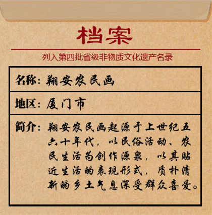 弄車鼓、唱南音、田間農(nóng)作、采茶摘果……寥寥數(shù)筆,濃郁的閩南風(fēng)土人情躍然紙上。翔安農(nóng)民畫起源于上世紀(jì)五六十年代,以流傳在民間的民俗活動、農(nóng)民生活為創(chuàng)作源泉,以其貼近生活的表現(xiàn)形式,質(zhì)樸清新的鄉(xiāng)土氣息深受群眾喜愛。 近年來,翔安農(nóng)民畫在保護、傳承方面如火如荼,不僅入選了福建省非物質(zhì)文化遺產(chǎn)代表性項目,還在不斷思變中取得了不小的成績。如今,翔安農(nóng)民畫已由紙質(zhì)向其他載體發(fā)展。翔安正謀求“以文養(yǎng)文”,進一步挖掘鄉(xiāng)土文化潛力,以期讓翔安農(nóng)民畫走得更遠,品牌更響。