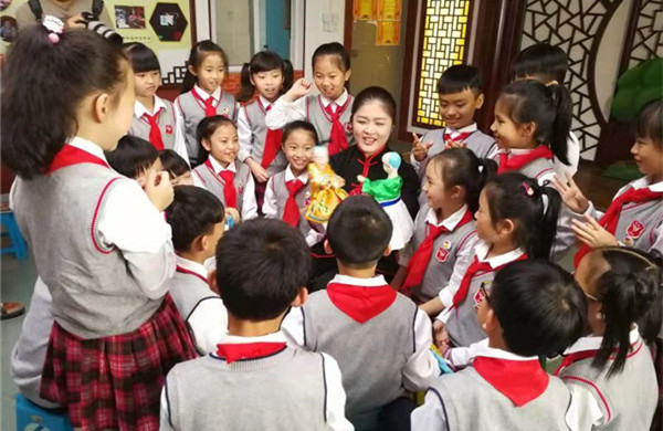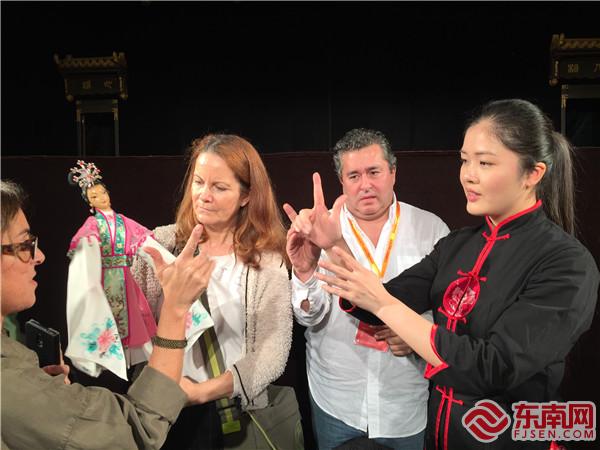 蔡美娜向外國友人傳授晉江掌中木偶技藝。受訪者供圖 為了讓更多人了解晉江掌中木偶戲,蔡美娜與劇團同事克服種種困難,堅守在表演領(lǐng)域傳播這項藝術(shù)文化。2016年,第五屆上海國際木偶藝術(shù)節(jié)上,蔡美娜表演完畢回到后臺,一名外國嘉賓便找到了她,跟她學(xué)了幾個掌中木偶的表演動作,“雖然我們語言不通,但是藝術(shù)是沒有界限的。”這次經(jīng)歷給蔡美娜留下了深刻印象,她意識到將這項藝術(shù)繼續(xù)傳承并發(fā)揚創(chuàng)新的重要性?!啊九既瞬排囵B(yǎng)計劃’在2012年被聯(lián)合國教科文組織列入人類非物質(zhì)文化遺產(chǎn)優(yōu)秀實踐名冊,作為南派布袋戲省級代表性傳承人,對發(fā)揚傳承這項藝術(shù),我也有義不容辭的責(zé)任?!?/p>