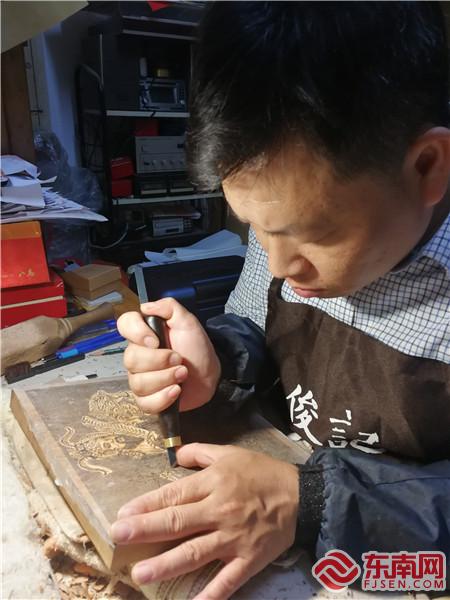 顏仕國展示傳統(tǒng)木版《魁星點斗》。東南網(wǎng)記者 陳志遠(yuǎn) 攝 53歲的顏仕國是漳州顏氏木版年畫的第六代傳人,專擅印刷。據(jù)他介紹,目前他家位于漳州古城的老房子里收藏著兩千多個文字字版,上百個年畫雕版,數(shù)量屬國內(nèi)之最。顏仕國說,顏氏印制人物、動物等年畫,采用五色或六色套印,先印淺色的白、紅、黃、綠,最后印黑色;絕活是功德紙,就是用黑色紙印制民俗活動所需的各種圖案,是全國木版年畫僅有的一個品種。 顏仕國從11歲開始學(xué)習(xí)印刷,自小在木版、染料與紅紙間穿梭,逐漸習(xí)得印刷技藝。2006年,顏仕國帶著近百幅年畫趕赴西安參加全國木版年畫展,漳州木版年畫大放異彩,一舉獲得國內(nèi)專家的高度贊譽(yù)。 2008年顏仕國與父親顏文華被共同列為第二批省級非遺代表性傳承人。2009年,80歲的顏文華病逝,2018年,顏仕國成為漳州木版年畫唯一的國家級非遺代表性傳承人。 “首先要對傳統(tǒng)文化習(xí)俗有敬畏之心”,顏仕國這樣說到。出生于木版年畫世家的他,身上洋溢著深厚的梨木氣息。在他家里到處掛著木版年畫,內(nèi)容大多圍繞風(fēng)俗節(jié)令、宗教祭祀等題材,體現(xiàn)了勞動人民對傳統(tǒng)習(xí)俗的敬畏和對美好生活的向往。 顏仕國擅長印刷,調(diào)色時所需的各種顏色配料的配比數(shù)據(jù),現(xiàn)在顏氏家族中只有他較為熟稔。過去漳州木板年畫的印制過程只在自家屋子里,謝絕外人觀看,而如今,在木版年畫的保護(hù)傳承方面,比起“金屋藏嬌”,顏仕國認(rèn)為應(yīng)該打破這層傳統(tǒng)桎梏,積極對外開放,讓更多人來了解這項技藝。 顏朝俊:復(fù)刻經(jīng)典 對接文創(chuàng) 顏朝俊的爺爺顏玉成與顏仕國的父親顏文華是親兄弟,在過去,顏文華負(fù)責(zé)年畫套色印刷,顏玉成負(fù)責(zé)雕版,分工明確,因而顏朝俊自小模仿著家中長輩,摸索雕版技巧。