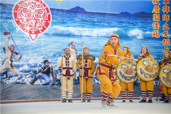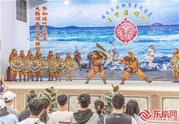 藤牌操表演 江信恒 攝 平潭藤牌操又稱“藤牌舞”,發(fā)源于明嘉靖年間,由抗倭名將戚繼光所創(chuàng)的戰(zhàn)陣戰(zhàn)術(shù)“鴛鴦陣”演變而來,即讓兵勇手執(zhí)藤制盾牌,配長短兵器,在陣法之中跳躍滾動,前進(jìn)殺敵。 據(jù)史載,明清以來,平潭一直是海防重地。戚家軍入駐平潭后,發(fā)動當(dāng)?shù)乇虏倬殹傍x鴦陣”,抵御倭寇,該陣式因此在平潭日益普及,經(jīng)過歷代改良,慢慢演變?yōu)椤疤倥撇佟薄?/p> 民國初年,平潭因積貧積弱導(dǎo)致疾病盛行,民眾遂將藤牌操視作健身活動,大練藤牌操,以驅(qū)邪降癘,強(qiáng)身健體。藤牌操迎來了“黃金時代”,一度風(fēng)靡嵐島。 后來,當(dāng)?shù)刂鋷熽愬\和將藤牌操與技擊、體操、舞蹈等相融合,形成了一字長蛇、二龍戲珠、三才定穴等十個陣法,以及太公獨(dú)釣、仙人指路、觀音坐蓮等三十六套招式,這才確立了沿襲至今的表演“范式”。藤牌操也逐漸成為民間文娛活動中的“藤牌舞”。