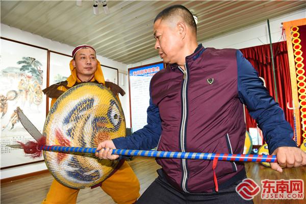 陳文英正在練習(xí)藤牌操 東南網(wǎng)記者 張哲昊 攝 走進(jìn)平潭藤牌操傳承基地三樓陳列室,記者一下就被墻邊整齊擺放著的長槍、短刀、鹿角叉等兵器,以及造型各異的虎頭藤牌所吸引。 要靈活運(yùn)用這些兵器與藤牌陣法并非易事。陳文英告訴記者,藤牌操訓(xùn)練強(qiáng)度之大,讓不少學(xué)員望而卻步?!拔疫@一批師兄弟,大部分人就是倒在了‘鴛鴦步’這招上。”他說,許多人扛不住,新鮮勁兒一過就紛紛退出了。 陳文英口中的“鴛鴦步”,正是藤牌操的精髓所在。這種步法以腿上功夫見長,要求練習(xí)者蹲下身子,降低身體重心,雙手?jǐn)[好架勢,兩腿交叉快速前進(jìn),對體能要求極高。 現(xiàn)場,陳文英為記者演示了一遍“鴛鴦步”,只見他不僅步伐扎實穩(wěn)健,還能一邊舉起武器與藤牌比劃,一邊與旁人交流,大氣不喘一口?!叭裟軌蛴么苏行袆幼匀纾拍苓M(jìn)而學(xué)習(xí)陣法。”他說。 這并非一朝一夕之功。為了練好藤牌操,陳文英白天在外務(wù)工,晚上才一頭扎進(jìn)由石板條搭建的簡易訓(xùn)練場練操,時常一練就是一整夜,直到將“蹲跳滾爬”四項基礎(chǔ)功夫完全掌握,方才出師,這花了他3年多的時間。 在他看來,學(xué)藤牌操門檻不算高,最要緊的是需勤練不輟。之后,陳文英逐漸成長為藤牌操傳人中的中流砥柱,常利用空閑時間義授藤牌操,在當(dāng)?shù)匾逊e累了一定名氣,一年到頭要承接十?dāng)?shù)場演出。 可事與愿違,平潭藤牌操由盛再度轉(zhuǎn)衰,幾乎就是轉(zhuǎn)眼的事。 上世紀(jì)90年代末以來,藤牌操的觀眾逐年減少,老師傅相繼離世,其它藤牌手大多涌向外地謀生,而年輕一代卻不愿意接班。 更令人擔(dān)憂的是,藤牌操保留下的正宗套路僅余三分之一!若不加以保護(hù),很有可能會上演“人亡藝絕”的悲劇,這讓陳文英的心里火急火燎。 “藤牌操是老祖宗留下的遺產(chǎn),一定要守護(hù)好!”陳文英謹(jǐn)記師父的囑托,迫不及待地行動起來,開始了傳承藤牌操的“保衛(wèi)戰(zhàn)”。 傳承:破除舊規(guī),煥發(fā)新活力
