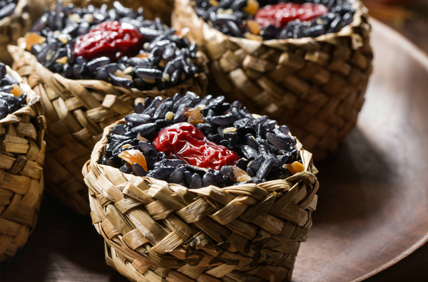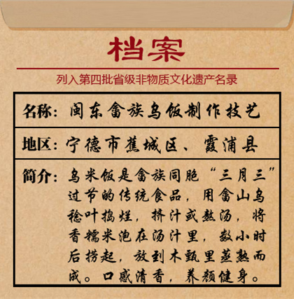 草袋烏米飯。受訪者供圖 烏米飯是用畬山特有植物烏稔葉搗爛,擠汁或熬湯,將香糯米泡在湯汁里,數(shù)小時后撈起,放到木甄里蒸熟而成。 “畬族歷來有‘三月三,染烏飯’的習(xí)俗,烏飯對畬家人意義非凡?!?017年成為閩東畬族烏飯制作技藝省級代表性傳承人的吳立強介紹說,每年農(nóng)歷三月三,是畬民敬天地、祖宗的節(jié)日。這一天,畬族村民不出工,男女青年成群結(jié)隊外出春游,采來野生植物烏稔葉,制作烏米飯,緬懷先祖,預(yù)祝豐收。 烏米飯起源可追溯到唐朝,相傳畬族的兩位先祖因反抗當(dāng)朝政權(quán)壓迫,在斷糧絕草之際,偶得烏稔樹所結(jié)之果實而得以果腹,進而制出了“烏飯”。從此,每年農(nóng)歷“三月三”,畬民都會做烏米飯過節(jié),相沿成俗已有1300多年,是畬族三寶之一。 2011年12月,閩東畬族烏飯制作技藝被列入省級非物質(zhì)文化遺產(chǎn)名錄,它也是福建唯一入選中國民族餐飲委員會推薦的民族特色餐飲美食。