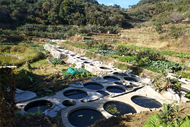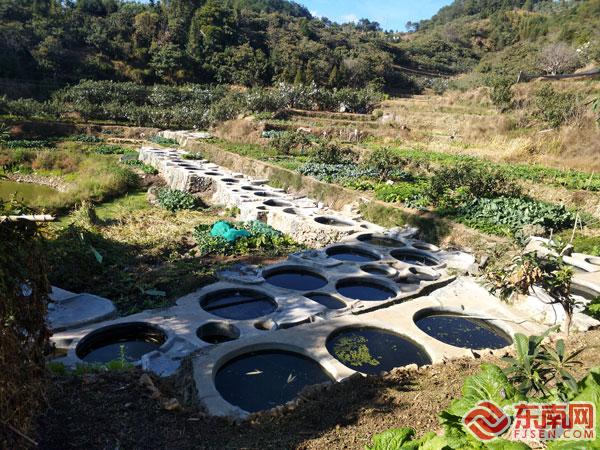 提煉青黛的坑池。 東南網(wǎng)記者 梁麗萍攝 在書峰鄉(xiāng)的村莊,不難見到一些集中分布的圓形坑池??映氐拇笮〔灰?,大池的直徑2米、深1.5米左右,小池直徑0.8米、深1米左右??映貎?nèi)壁、池底均用水泥抹平,池的上下各留一個小洞,這些大大小小的坑池便是加工制作青黛的浸泡池。 仙游青靛提煉技藝非遺代表性傳承人林文喜告訴記者,仙游建青黛炮制的傳統(tǒng)工藝是將已收割的馬藍(lán)葉或莖葉置于浸泡池內(nèi),用清水浸泡2~3晝夜,至馬藍(lán)莖葉完全腐爛、池液呈污綠色為止,撈去莖稈殘渣與粗纖維。之后,投入適量的殼灰乳,充分?jǐn)嚢?,至池液呈深藍(lán)色且液面出現(xiàn)大量的紫紅色泡沫時,用紗網(wǎng)篩撈起、曬干,即為“大沫”,這個過程也叫初次水飛。 等浸泡液泡沫減少時,可靜置沉淀4小時左右,將沉淀物篩去碎渣,移至小池,加水?dāng)嚢柘礈?,即再次水飛,取沉淀物,制“澱”(又稱粗靛或藍(lán)靛)即告完成。之后,將“澱”與水按一定比例放置在適宜的容器中進(jìn)行數(shù)次水飛精深加工,曬干或烘干、研細(xì),即為建青黛飲片。