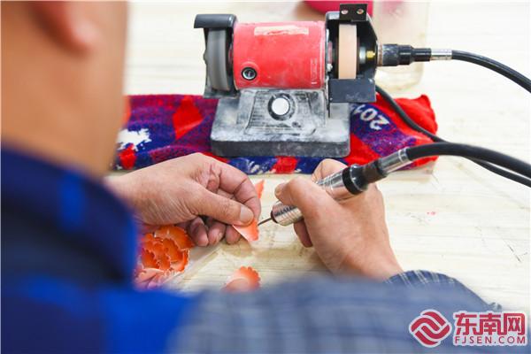 詹勝現(xiàn)場演示貝雕制作過程 受訪者供圖 嘗到了甜頭的詹勝沒有停下傳承的腳步,而是懷著一顆不褪色的“匠人之心”,與貝雕工匠們一同創(chuàng)造出更多獨特的作品,推動平潭貝雕登上更高的舞臺—— 2018年10月,在莫斯科舉辦的“福建省文化產(chǎn)業(yè)金磚國家(俄羅斯)展覽會暨福建文化日活動”上,詹勝的作品《活蟹》一經(jīng)展出,便“吸粉”無數(shù);2019年3月,平潭貝雕獲批成為省級非遺項目;2019年底,貝雕作品《玉堂春暉》和《清蓮》運抵非洲加納,分別贈給了加納總統(tǒng)及部長。 對此,他坦陳,平潭綜合實驗區(qū)文旅產(chǎn)業(yè)蓬勃發(fā)展為手藝人帶來了更多機遇,也讓大家對傳承這份技藝的信心更大、底氣更足。 隨著平潭貝雕產(chǎn)業(yè)鏈逐步恢復(fù),越來越多年輕人注意到這項傳統(tǒng)技藝。以此為契機,詹勝開設(shè)貝雕培訓(xùn)班,招收了多名學(xué)員,將自己的技藝傾囊相授,推動貝雕傳承與發(fā)展。