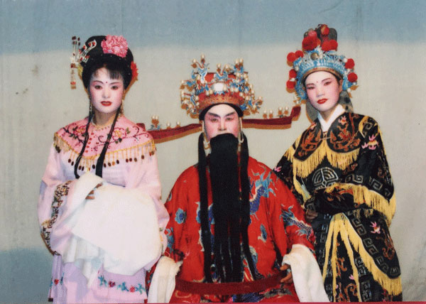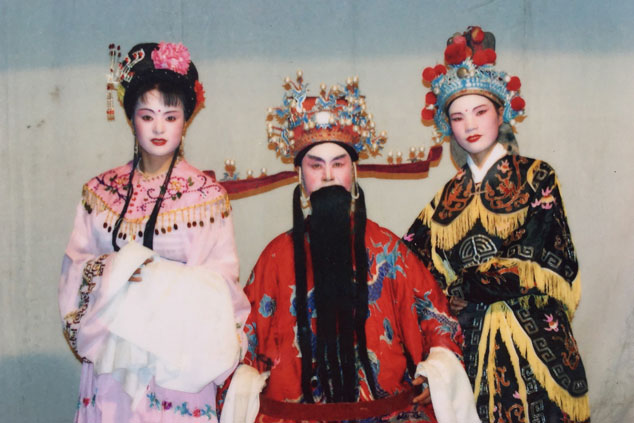 虞東生和徒弟合影。受訪者供圖 “之所以叫做三角戲,是因?yàn)樵戎挥猩?、旦、丑三個角色。”虞東生一邊搬出他的“寶貝”,一邊和記者解釋道:“它是由花鼓戲、黃梅戲、采茶戲、邵武民歌融匯演變而成,講的是老百姓的日常生活,主角們都是農(nóng)民、小商販、土財主之類,很受老百姓喜歡。”出生于1944年的虞東生,自小就與戲結(jié)緣,介紹起三角戲來,更是如數(shù)家珍。 虞老說,他從小就是個“戲迷”,常常在戲臺旁邊看邊模仿。“10歲時,我整天泡在村里的戲團(tuán)學(xué)戲。”虞東生回憶,“雖然年齡小,但是我記性好,學(xué)唱腔、動作、樂器都比大人快。跟黃師傅學(xué)習(xí)1年后,我就能在排戲缺人的時候頂戲,有時候還教大人表演?!?/p> 1960年的一個晚上,虞東生到城里觀看越劇后,詢問越團(tuán)負(fù)責(zé)人是否收人,得到的回答是“只要女的,不要男的”,難過和失落涌上心頭。當(dāng)時,他便抱定決心一定要進(jìn)劇團(tuán)。 “沒過多久,我又找到三角劇團(tuán)團(tuán)長黃敏杰。他說進(jìn)劇團(tuán)要考,我學(xué)過戲當(dāng)然不怕考試!”下半年,虞東生便抱著父親買的二胡進(jìn)了邵武縣三角劇團(tuán)。 進(jìn)劇團(tuán)后,虞東生追隨羅雪官、付子卿、周老三等師父學(xué)習(xí)三角戲,以扮演老生為主,也客串些其他角色。由于對樂器的偏愛,他利用業(yè)余時間向樂師學(xué)二胡、笛子、鑼、鈸、嗩吶等;每到一個地方演出,他還會向當(dāng)?shù)乩先嘶蚯拜呎埥虘蛩嚭颓V,并把所學(xué)的樂譜都記下來。 獨(dú)奏一場戲 練“絕活”一心多用