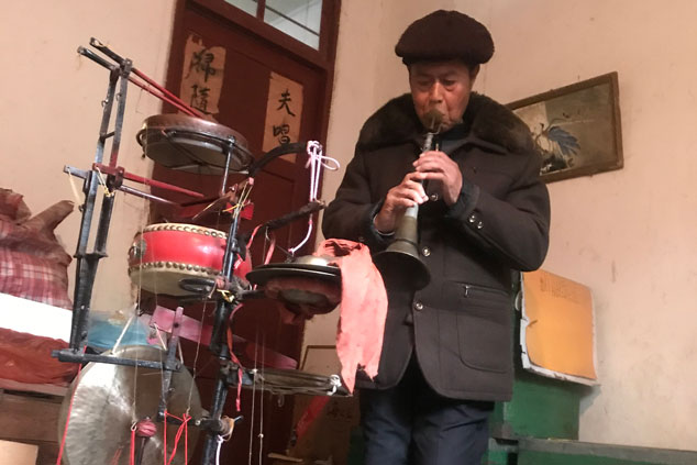 虞東生演示“絕活”。劉建飛攝 “我試著把大鑼、小鑼、大鼓、小鼓、叫鑼、鈸和板等樂器焊接到一套道具上,自已做‘獨(dú)門樂器’。像這樣,一邊用腳踩擊大鑼、小鑼、大鼓、小鼓、叫鑼、鈸和板,一邊用嘴吹笛子或嗩吶。”虞東生一邊說,一邊擺弄著他的“獨(dú)門樂器”。 “工具做出來后,練就 ‘絕活’還得靠自己。剛開始練的時候非常難,不是忘了手就是忘了腳,總是配合不好。但是我堅(jiān)持每天都練,練到腳打抖,抬腳都難?!本瓦@樣足足練了四個月,虞東生的“絕活”終于練成了。他一人能攬下6個人的活,同時演奏8 種樂器,成了“一心多用”的器樂手。中央、省、市多家媒體都曾對他這一絕活進(jìn)行報道。 虞東生還有另一個 “絕活”——飾演《天官賜?!防锏奶旃?。每當(dāng)鄉(xiāng)村開新臺,這個節(jié)目是必上的。節(jié)目里只有天官一人主唱,其他十三個演員圍著天官轉(zhuǎn)。能扮演天官的都是德高望重的老藝人,除現(xiàn)年90歲的老前輩劉明外,村里只有虞東生能演天官?!斑@么多年,只有我會在開新臺時表演?!闭f到此事,虞老頗為自豪。 潛心譯舊譜 教徒弟傳承文化
