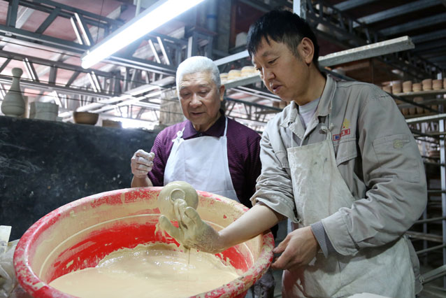 林俊檢查陶土情況。 莊偉杰攝 要制作出精美絕倫的藝術(shù)品,不僅設(shè)備要“古早”,制作技藝也得講究傳統(tǒng)。在漳州古陶瓷工藝研究所里,直徑3米的古老水車、30米長(zhǎng)的水池、2米高的生火窯爐……一派古老窯址的原貌。在這里,捶打、淘洗瓷土的工藝用的都是古法,與復(fù)原的古代設(shè)備相得益彰。 “制作一件東溪窯瓷器,前后要?dú)v經(jīng)幾十道工序?!绷挚”硎?,從大的方面來(lái)說(shuō),練泥、拉坯、彩繪、晾坯、燒窯是制作東溪窯瓷器的主要工序,但每一道工序里又包含好幾道小工序?!耙詫?duì)挖掘出來(lái)的陶土處理為例,陶土的不同部位用途不一樣,要分門別類??拷脖荒菍硬荒苡?,須舍棄,比較堅(jiān)硬部位還要選出來(lái)用作釉水的材料?!绷挚〗榻B,分類好后,對(duì)陶土不同部位的捶打處理也不一樣。“用來(lái)制作瓷泥的陶土要經(jīng)過(guò)兩天兩夜的捶打,之后在水里淘洗,最后放入水池陳腐一周左右的時(shí)間。用作釉水材料的陶土則要磨成粉末?!?/p>