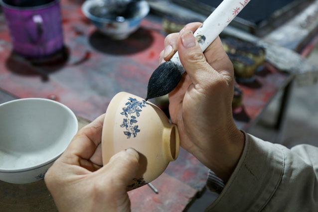 東溪窯瓷器彩繪尤為講究,紋飾有洞石花卉、纏枝菊花、山水、寒江獨(dú)釣等。 莊偉杰攝 除了堅(jiān)持傳統(tǒng),東溪窯傳統(tǒng)燒制技藝的可貴之處還在于精益求精?!懊總€(gè)環(huán)節(jié)都要下足功夫,馬虎不得,若某個(gè)環(huán)節(jié)出錯(cuò),成品很可能開裂,就白費(fèi)功夫了?!绷挚〗榻B,以上釉為例,坯體繪飾完成后,在表面涂上一層玻璃質(zhì)的釉藥是極為重要和較難掌握的一道工序。“要做到造型中各個(gè)部分的釉層均勻一致是件不容易的事。上釉前還需用手試釉,目測(cè)釉的濃稀是否適用?!痹诹挚】磥?lái),與其他瓷器燒制相比,東溪窯傳統(tǒng)燒制技藝最大的特色是,從最初的取材到最后的出窯,每一道工序都最大程度地堅(jiān)持傳統(tǒng)并在同一條“生產(chǎn)線”完成,這在全國(guó)燒窯技藝中比較少見。 申遺路,見證窯煙重燃