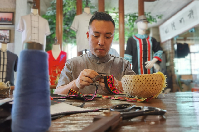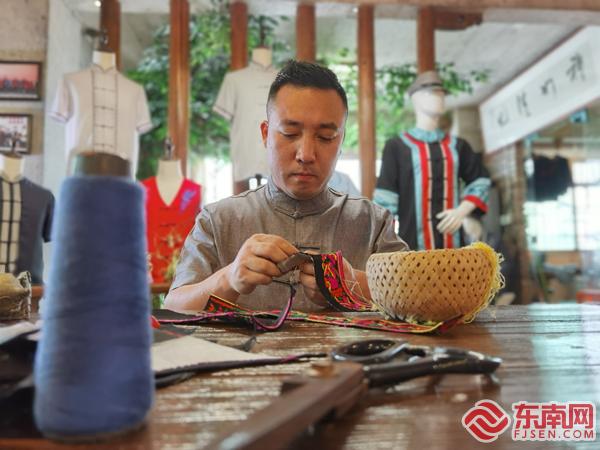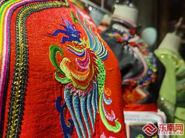 精致的刺繡。東南網(wǎng)記者葉伏國 攝 回憶起學(xué)藝時(shí)的經(jīng)歷,林章明表示,刺繡是學(xué)做畬服中最難的部分,一針一線都是挑戰(zhàn),沒有耐心和勤奮是無法學(xué)成的。正是因?yàn)槊靼走@一點(diǎn),林章明每天加緊練習(xí),他的刺繡功夫突飛猛進(jìn)。雖是男子,林章明刺繡的活計(jì)一點(diǎn)不輸心靈手巧的女子。 1998年,拜師學(xué)藝出師后的林章明在蕉城經(jīng)營一家自己的服裝裁縫店。店鋪開設(shè)初期,畬族服飾只是其他日常服裝的陪襯,訂單較少,除了傳統(tǒng)節(jié)日、歌會(huì)和族內(nèi)重大慶典活動(dòng)外,平時(shí)來定做畬族服飾的畬民寥寥無幾。 隨著生活方式的轉(zhuǎn)變,畬族傳統(tǒng)服飾文化受到了不小的沖擊,林章明依然堅(jiān)守著老師傳給他的手藝,不斷探索提高,成為了一名地地道道的“守藝人”。 “盡管傳承是艱難的,但使命光榮?!绷终旅髡f,一套純手工畬服價(jià)格一般在兩三千元,市場需求量極小,但他沒有放棄?!跋嘈女屪鍌鹘y(tǒng)服飾會(huì)因獨(dú)特的魅力而被重視?!闭且?yàn)檫@份熱愛,林章明在畬服制作的路上越走越堅(jiān)定。 林章明從學(xué)藝到出師,到自己制作畬族服飾,再到傳承畬族技藝……雖不是畬族人,但和畬族結(jié)下了深厚的感情。他希望更多人認(rèn)識(shí)畬族服飾,了解畬族文化還有畬族的歷史。他每年都積極開展畬族傳統(tǒng)服飾普及活動(dòng),與國內(nèi)高等院校師生探討交流,接待過北京大學(xué)、清華大學(xué)等10多所高校師生,開展多次畬族服飾展,常在青少年中開展畬族傳統(tǒng)手工藝DIY活動(dòng)。 巧運(yùn)匠心 優(yōu)化改良鳳凰裝