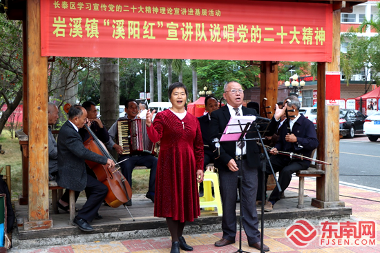 “共產(chǎn)黨為人民,得民心,二十大描繪美好的前程……”長(zhǎng)泰區(qū)珪后村鄉(xiāng)村公園里,一支由村里老人組成的“溪陽(yáng)紅”宣講隊(duì)格外引人注目,他們把黨的二十大報(bào)告金句串聯(lián)起來(lái),用閩南方言以說(shuō)唱的形式向村里群眾宣講,濃濃的鄉(xiāng)音格外接地氣,圍觀(guān)群眾紛紛叫好。 黨的二十大閉幕后,漳州市長(zhǎng)泰區(qū)迅速?gòu)母鞯馗鲉挝怀檎{(diào)骨干,成立11支理論宣講小分隊(duì)。11月2日上午,長(zhǎng)泰區(qū)在巖溪鎮(zhèn)珪后村啟動(dòng)“學(xué)習(xí)宣傳黨的二十大精神理論宣講進(jìn)基層活動(dòng)”,區(qū)委常委、宣傳部部長(zhǎng)陳貴芬向全區(qū)9個(gè)鄉(xiāng)鎮(zhèn)(場(chǎng)、區(qū)、辦事處)、區(qū)直機(jī)關(guān)黨工委、教育局組成的宣講小分隊(duì)授旗。區(qū)委黨校教師作了題為《團(tuán)結(jié)奮發(fā)繪宏圖 百年圓夢(mèng)譜新篇——深入學(xué)習(xí)貫徹中國(guó)共產(chǎn)黨第二十次全國(guó)代表大會(huì)精神》專(zhuān)題輔導(dǎo)報(bào)告。