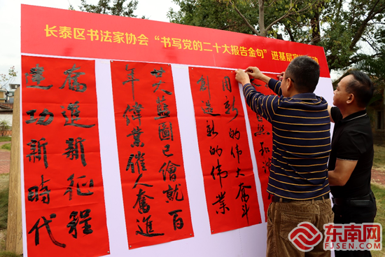 妙筆寫(xiě)金句,紅心永向黨。當(dāng)天上午,在巖溪鎮(zhèn)珪后村,長(zhǎng)泰區(qū)書(shū)法協(xié)會(huì)和燈謎協(xié)會(huì)還聯(lián)合舉辦“宣傳貫徹黨的二十大精神”主題書(shū)法展示和燈謎競(jìng)猜等活動(dòng),吸引不少群眾積極參或駐足觀(guān)看,現(xiàn)場(chǎng)氣氛熱烈。“今天我們村通過(guò)書(shū)法展覽、紅歌會(huì)、猜燈謎等形式組織大家一起學(xué)習(xí)黨的二十大的精神,我覺(jué)得很接地氣,也很有趣。”參加活動(dòng)的群眾高興地表示。(泰融 文/圖) |