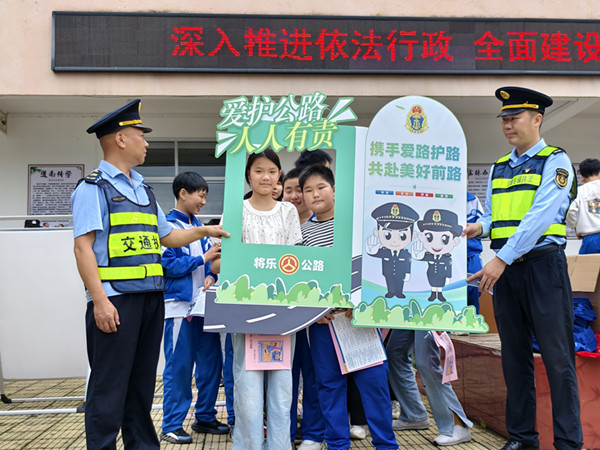 學生們在愛路護路拍照墻上有序進行打卡拍照。 進?!按蚩ā保裣聬勐纷o路種子 5月12日上午,將樂公路安全路產(chǎn)人員聯(lián)合縣交通運輸綜合執(zhí)法大隊到大源中心學校開展路政宣傳活動。“一二三,愛路護路,人人有責,茄子”,將樂路政宣傳通過充滿童趣的拍照打卡以及愛路護路,人人有責簽名欄等形式,一下激起了同學們參與的積極性。同時還通過視頻課件,用通俗易懂的語言、發(fā)散性問題介紹公路的特點,講解公路安全小知識。講解結(jié)束后還分發(fā)宣傳手冊并設置有獎競答環(huán)節(jié),以鞏固此次學習成果,通過本次行動,小朋友們對路產(chǎn)路權(quán)有了更深刻的理解,順利在孩子心中種下愛路護路的“法治種子”。