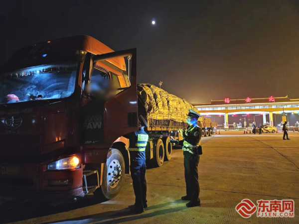 執(zhí)法檢查。寧德高速執(zhí)法支隊供圖 行動中,雙方人員針對夜間車流特點,采取定點檢查與流動巡查相結(jié)合的方式,依托收費站磅秤等稱重設備,對過往貨運車輛、旅游包車、客運班車及危險貨物運輸車輛逐一排查。對于普通貨物運輸車輛,執(zhí)法人員除核查載重數(shù)據(jù)外,還使用皮尺、卷尺等工具,細致測量車輛裝載貨物的長、寬、高,嚴查超高、超寬、超長等違法情形;針對“兩客一?!避囕v,同步檢查車輛資質(zhì)、駕駛員從業(yè)資格及貨物裝載合規(guī)性。