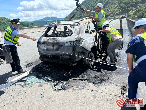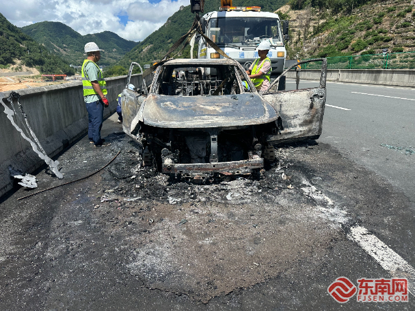 事故救援現(xiàn)場。寧德高速執(zhí)法支隊供圖 事故現(xiàn)場濃煙彌漫,燃燒車輛占據(jù)主車道及應(yīng)急車道,嚴(yán)重威脅通行安全。執(zhí)法人員立即設(shè)置安全警示區(qū)并擺放反光錐筒,聯(lián)動高速交警、路勤中心協(xié)同處置。經(jīng)確認(rèn),車內(nèi)4名司乘人員(含兒童)已全部安全轉(zhuǎn)移至護(hù)欄外,未造成人員傷亡。14時整,福鼎市消防救援大隊3輛消防車到達(dá)現(xiàn)場,經(jīng)30分鐘專業(yè)撲救完全撲滅明火。執(zhí)法人員同步完成路產(chǎn)勘驗,配合清障部門快速拖離事故車輛,于14時30分全面恢復(fù)道路通行。