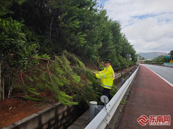 處理倒伏樹木。寧德高速執(zhí)法支隊供圖 與此同時,大隊加密了對轄區(qū)在建施工項目的巡查頻次與安全監(jiān)管力度。執(zhí)法人員重點檢查施工現(xiàn)場安全設(shè)施及工程設(shè)備安全性能,并加強現(xiàn)場安全提醒,督促施工單位嚴格落實臺風(fēng)天氣安全防范措施。對于存在重大風(fēng)險隱患或不符合安全要求的施工作業(yè),則堅決要求停工整改,切實保障施工人員及道路通行安全。