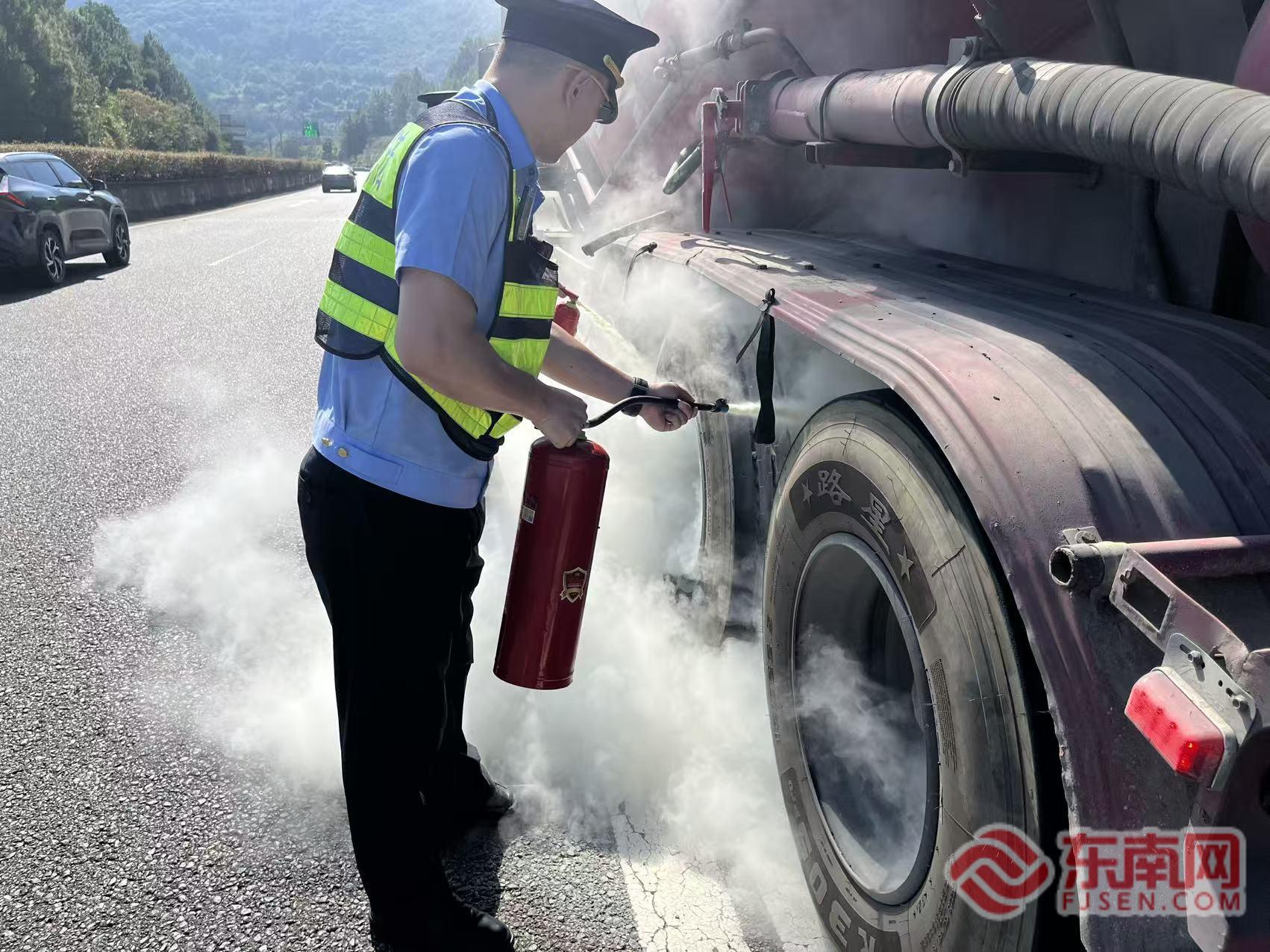 東南網(wǎng)10月9日訊(通訊員 林棟 戚盛楠)“嘭”的一聲,高速大貨車輪胎發(fā)生爆炸,黑煙沖天。10月4日9時(shí)許,寧德高速執(zhí)法支隊(duì)在京臺(tái)高速A1812+70m路段開展保暢路巡時(shí),發(fā)現(xiàn)一輛運(yùn)載水泥的貨車輪胎突發(fā)火情,現(xiàn)場(chǎng)濃煙伴隨明火,情況危急。