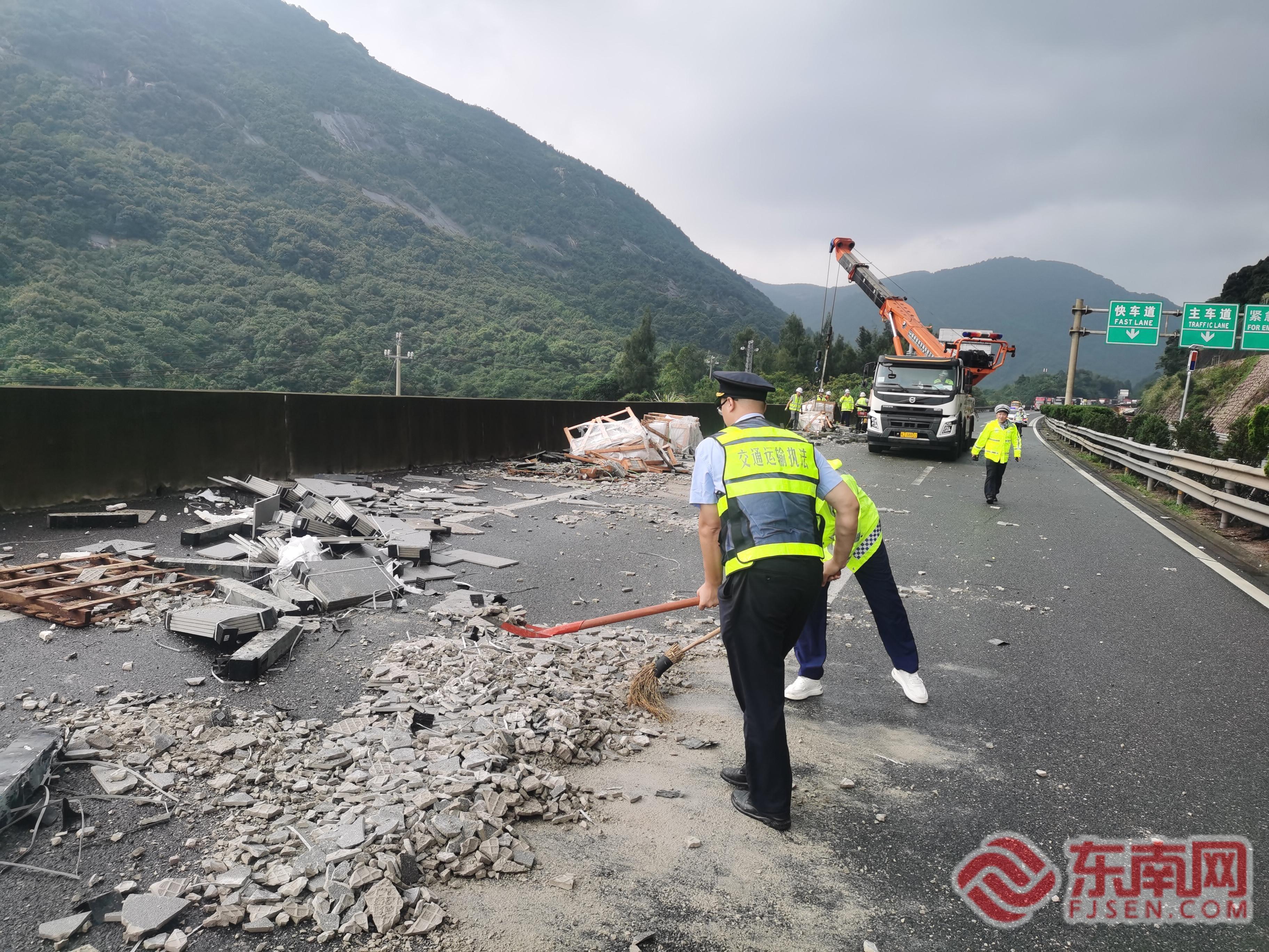 處理灑落物事故。寧德高速執(zhí)法支隊(duì)供圖 8時(shí)13分,路網(wǎng)中心傳來(lái)的警報(bào)打破了晨間的寧?kù)o。霞浦中隊(duì)執(zhí)法人員僅用3分鐘完成出勤準(zhǔn)備,于8時(shí)16分疾馳向事故現(xiàn)場(chǎng)。8時(shí)45分抵達(dá)時(shí),破碎瓷磚將道路完全封堵。執(zhí)法人員迅速在事故后方200米處架起反光錐筒組成的“生命防線(xiàn)”,與隨后趕來(lái)的高速交警、路勤人員組成臨時(shí)搶險(xiǎn)隊(duì)。9時(shí)整,隨著第一車(chē)碎瓷磚被裝載清運(yùn),這場(chǎng)“清障大會(huì)戰(zhàn)”正式打響。
