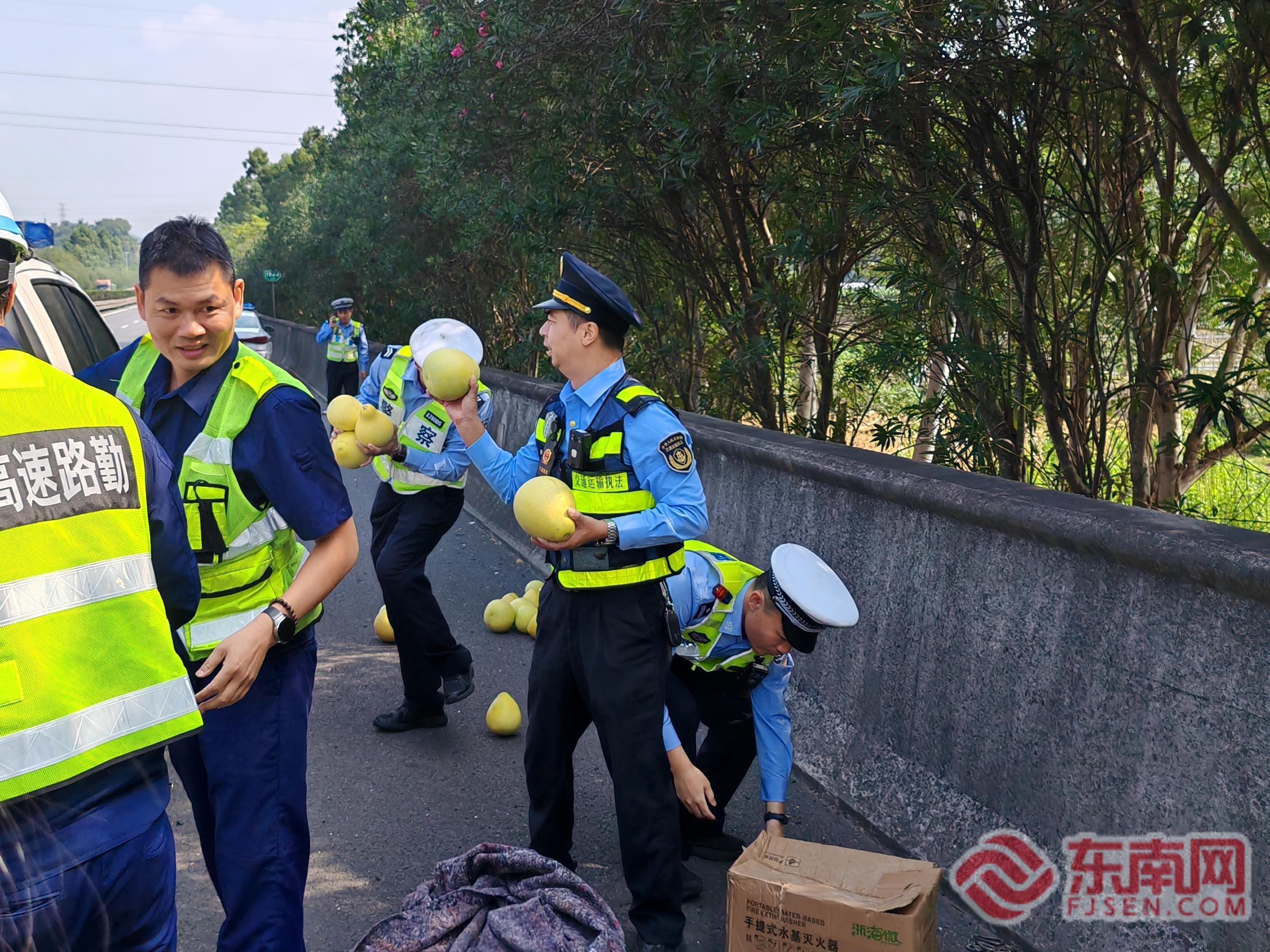 合力處置灑落柚子。寧德高速執(zhí)法支隊供圖 情況緊急,刻不容緩。執(zhí)法人員立即啟動應急預案,同步激活“5+N”協(xié)作機制。現(xiàn)場各方力量分工明確、協(xié)同高效:一組人員迅速負責現(xiàn)場安全布控,在事故后方規(guī)范設置警示區(qū)域,擺放反光錐筒,并指揮引導后方車輛有序通行;另一組人員則與聞訊趕來的高速交警、路勤、養(yǎng)護等聯(lián)動單位并肩協(xié)作,以應急車道為主作業(yè)面,全力投入散落柚子的清理與轉(zhuǎn)運工作。整個處置流程銜接緊密,各方配合默契,形成了高效的處置合力。
