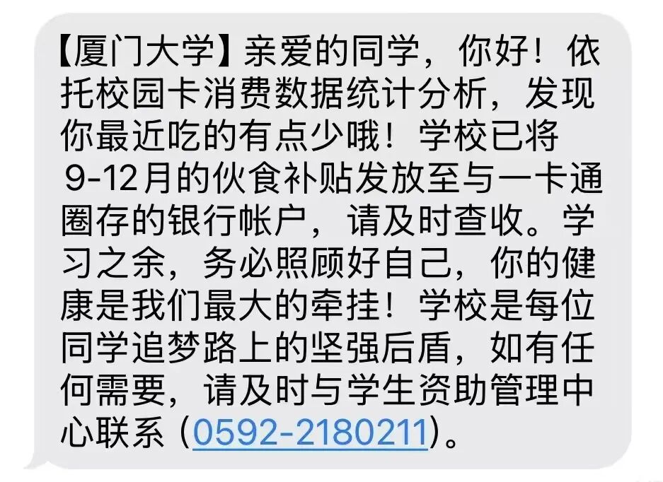 近日,不少廈大學(xué)子發(fā)現(xiàn)銀行卡中多出一筆款項,隨之收到的是一條暖心短信:“同學(xué),發(fā)現(xiàn)你最近吃得有點少哦!學(xué)習(xí)之余,務(wù)必照顧好自己……”這則溫馨的短信背后,是一種超越傳統(tǒng)救助模式的教育實踐正在悄然展開?!半[形資助”——無需申請、主動發(fā)放的幫扶機制,不僅是物質(zhì)上的支持,更是一次關(guān)乎尊嚴、信任與育人理念的生動詮釋。它讓我們看到,卓越的大學(xué)育人工作,既要有細致入微的“溫度”,又需具備立意深遠的“高度”。