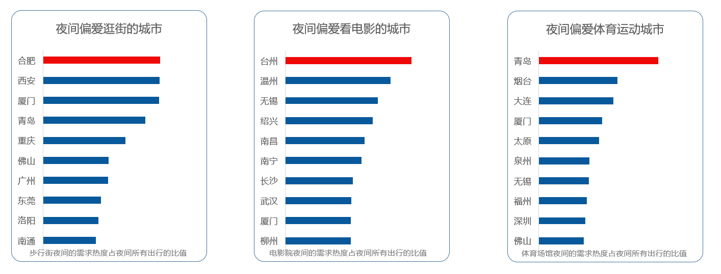 城市夜生活出行偏好大揭秘 夜晚出門,除了喝酒擼串,你還會(huì)去哪兒?高德大數(shù)據(jù)統(tǒng)計(jì)了夜間前往“商業(yè)步行街”、 “電影院”、“體育場館”三類出行目的地的人群占總?cè)藬?shù)的占比。