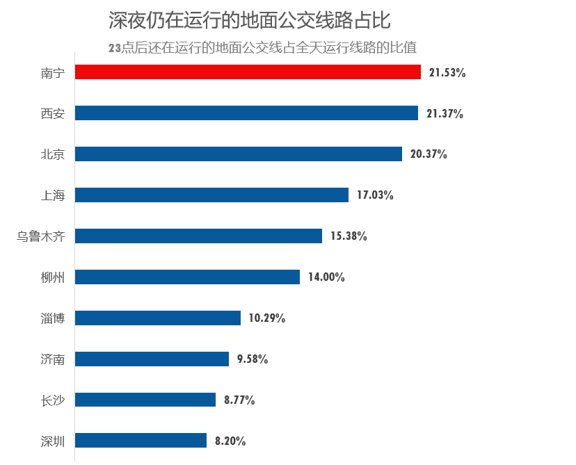 從全國50個(gè)主要城市夜間公交地鐵出行需求來看,排名前10位的城市夜間公交地鐵出行占比差距較小,排名第一為廣州,公交地鐵的夜間出行占比達(dá)16.45%,北京則成為前十名中唯一一個(gè)北方城市。 公交便捷度是能夠更直接反映城市公交系統(tǒng)運(yùn)行水平的指標(biāo),主要考量城市夜間運(yùn)行公交線路的覆蓋區(qū)域。數(shù)據(jù)顯示,南寧在23點(diǎn)之后還在運(yùn)行的公交線路占比全國最高,其次為西安、北京,比例均超出20%。