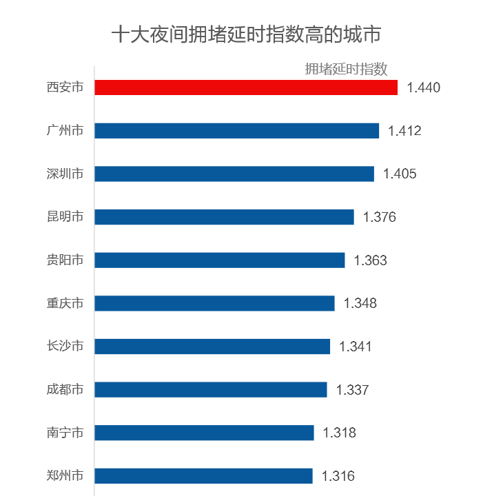 日前,高德地圖聯(lián)合“國家信息中心大數(shù)據(jù)發(fā)展部”、“中國社會(huì)科學(xué)院社會(huì)學(xué)研究所”等機(jī)構(gòu)共同發(fā)布《2019年Q3中國主要城市交通分析報(bào)告》(以下簡稱“《報(bào)告》”),首次提出“城市夜生活活躍度”評(píng)價(jià)指標(biāo),基于交通大數(shù)據(jù),從出行角度對(duì)城市夜經(jīng)濟(jì)運(yùn)行狀況進(jìn)行綜合評(píng)價(jià)。 五大維度 勾勒城市夜經(jīng)濟(jì)圖景 三季度報(bào)告,將城市夜生活活躍度評(píng)價(jià)指標(biāo)分為夜間擁堵、夜間經(jīng)濟(jì)、夜間駕車出行、夜間公交出行便利度以及夜間公共出行熱度五個(gè)維度,從出行的角度對(duì)城市夜經(jīng)濟(jì)運(yùn)行狀況進(jìn)行綜合評(píng)價(jià)。 越夜越堵 西安鐘樓成全國最熱“夜間CBD” 夜間道路擁堵,從一個(gè)側(cè)面說明城市夜間車輛活躍程度相對(duì)較高,夜生活較為豐富。從全國夜間擁堵熱力分布圖來看,全國夜間擁堵熱力分布主要在四大經(jīng)濟(jì)區(qū),其中珠三角擁堵熱度最高。 具體到城市,西安成為當(dāng)之無愧的“十二時(shí)辰”不夜城,夜間擁堵延時(shí)指數(shù)達(dá)到1.440,排名第一位,緊隨其后的是廣州與深圳。西安鐘樓、廣州天河南、深圳老街、昆明火車站、貴陽中山西路、重慶紀(jì)念碑、長沙五一廣場、成都春熙路、南寧朝陽廣場和鄭州二七廣場則位列全國十大夜間最堵商圈,是當(dāng)之無愧的夜間“CBD”。