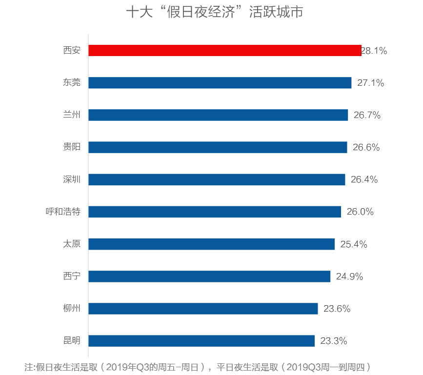 從數(shù)據(jù)來看,夜經(jīng)濟(jì)活躍度呈現(xiàn)明顯的北低南高特點(diǎn)。數(shù)據(jù)顯示,相對(duì)活躍度最高的五個(gè)城市為深圳、東莞、泉州、佛山和南寧,相對(duì)活躍度最低的五個(gè)城市則為煙臺(tái)、淄博、哈爾濱、保定和長春。 周末“狂歡夜” 西部地區(qū)成假日夜經(jīng)濟(jì)主力軍 餐飲、娛樂、購物、體育休閑,是城市中與夜經(jīng)濟(jì)息息相關(guān)的出行目的地。通過節(jié)假日(周五至周日)相比平時(shí)(周一至周四)的夜間出行情況,能夠反映出當(dāng)?shù)丶偃找菇?jīng)濟(jì)的熱度。 假日夜經(jīng)濟(jì)的活躍城市榜單,成為西部和華南的舞臺(tái)。在排名前五的城市中,西安、蘭州、貴陽三座西部城市分列第一、第三和第四位,東莞與深圳則位列第二與第五名。