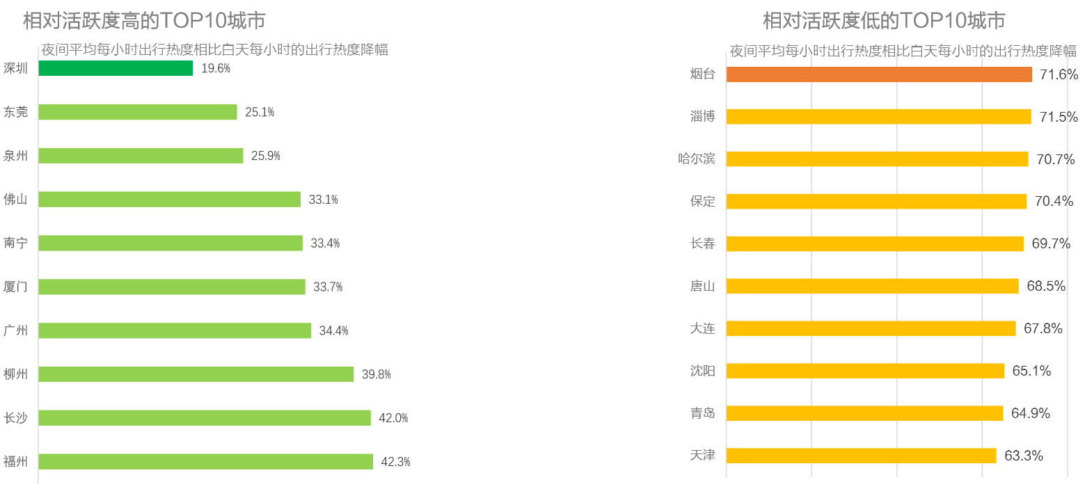 夜經(jīng)濟(jì)活躍度 “北低南高”地域差距明顯 餐飲、娛樂、購物、體育休閑,是城市中與夜經(jīng)濟(jì)息息相關(guān)的出行目的地。通過夜間相比白天的降幅,能反映出城市“夜經(jīng)濟(jì)的相對(duì)活躍程度”。