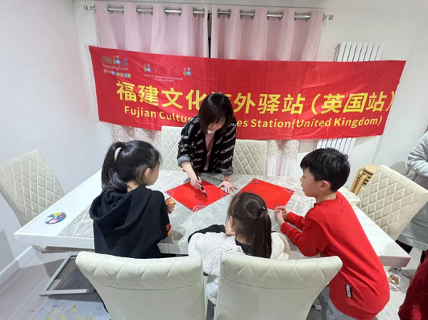 “清新福建下午茶”主視覺(jué)畫(huà)面 活動(dòng)現(xiàn)場(chǎng)展播了《福建見(jiàn)?!贰陡=ㄈ缒恪贰陡=?分鐘》等福建宣傳短片,展現(xiàn)了“清新福建”和中國(guó)傳統(tǒng)“?!蔽幕?。驛站工作人員還邀請(qǐng)英國(guó)友人及華僑華人一同寫(xiě)“福”字、寫(xiě)春聯(lián)、品嘗福建茗茶等,營(yíng)造了祥和喜慶的中國(guó)春節(jié)氛圍。