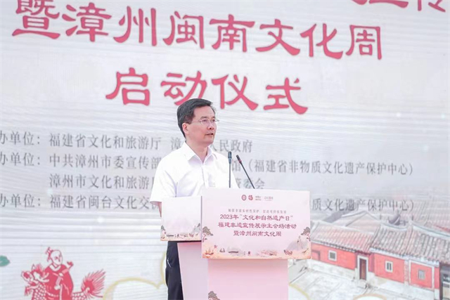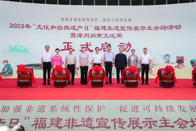 6月11日,由福建省文化和旅游廳、漳州市人民政府主辦,福建省藝術(shù)館(福建省非物質(zhì)文化遺產(chǎn)保護(hù)中心)、中共漳州市委宣傳部、漳州市文化和旅游局、漳州高新區(qū)管委會(huì)承辦,福建省閩臺(tái)文化交流中心、各設(shè)區(qū)市藝術(shù)館(文化館)、非物質(zhì)文化遺產(chǎn)保護(hù)中心協(xié)辦的2023年“文化和自然遺產(chǎn)日”福建非遺宣傳展示主會(huì)場活動(dòng)暨漳州閩南文化周啟動(dòng)儀式在漳州高新區(qū)“三館”市民文化廣場正式舉辦,拉開了2023年“文化和自然遺產(chǎn)日”福建非遺宣傳展示系列活動(dòng)的帷幕。 福建省文化和旅游廳黨組書記、廳長林向東,第十一、十二屆全國政協(xié)常委、中央文史研究館館員、中國書法家協(xié)會(huì)名譽(yù)主席蘇士澍,國防大學(xué)原副政委兼紀(jì)委書記、中將、中國楹聯(lián)學(xué)會(huì)名譽(yù)會(huì)長李殿仁,中國書畫收藏家協(xié)會(huì)會(huì)長張德俊,中央文史研究館書畫院原執(zhí)行院長馬新林,福建省文聯(lián)黨組成員、副主席、書記處書記王來文,福建省文化和旅游廳二級(jí)巡視員張立峰,中共漳州市委常委、宣傳部部長、統(tǒng)戰(zhàn)部部長吳衛(wèi)紅,漳州市人大常委會(huì)副主任吳芳華,漳州市人民政府副市長余向紅,漳州市政協(xié)副主席黃井南,福建省文化和旅游廳二級(jí)巡視員、非遺處處長蘇忠明等領(lǐng)導(dǎo)出席啟動(dòng)儀式。