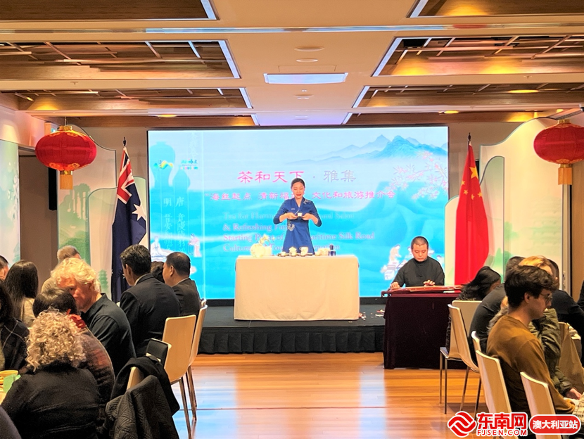 嘉賓欣賞茶藝表演。 東南網(wǎng)6月20日訊(本網(wǎng)特約記者 一禾)當(dāng)?shù)貢r(shí)間6月16日,“茶和天下·雅集”福茶品鑒專場(chǎng)活動(dòng)在悉尼中國(guó)文化中心舉辦,開(kāi)啟中國(guó)茶沉浸式體驗(yàn)之旅。 中國(guó)駐悉尼大使銜總領(lǐng)事周立民、副總領(lǐng)事王春生、文化參贊王書(shū)羽、教育參贊林曉青,悉尼中國(guó)文化中心主任兼中國(guó)駐悉尼旅游辦事處主任肖夏勇,福建省文化和旅游廳副廳長(zhǎng)肖長(zhǎng)培,新州前懲教部長(zhǎng)杰弗里·李,新州前上議員何沈慧霞,新州前上議員、悉尼市前副市長(zhǎng)曾筱龍,新州威樂(lè)比市議員夏毓奇,澳中友協(xié)新州分會(huì)主席瑪格麗特·凱麗以及澳友好人士、新南威爾士大學(xué)師生代表等40多人出席了活動(dòng)。肖夏勇、肖長(zhǎng)培致歡迎辭。