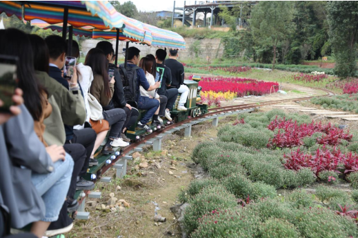 主播團(tuán)乘坐小火車觀賞俞邦村花海