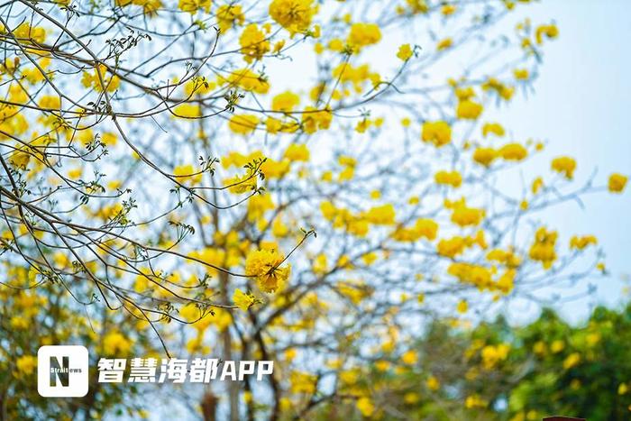 據(jù)介紹,宮粉紫荊花為近傘房狀的總狀花序,側(cè)生或頂生,花瓣5枚皆為淺粉色或淡紫色,獨獨旗瓣中間還染上幾筆黃綠色和暗紫色的斑紋。宮粉紫荊首次在1965年選定為香港的市花,1997年7月1日香港回歸中國成立香港特別行政區(qū)時更被用作特區(qū)區(qū)徽,以此借紫荊花花語之意表達兄弟和睦、情深骨肉、永不分離,體現(xiàn)出粵港澳是一家、大灣區(qū)深度融合的人文價值。 5.黃花風(fēng)鈴木:常被用來贈人,表示感謝 在市區(qū)口袋公園、東海中學(xué)綠地、南迎賓大道、普賢路、浦口環(huán)島周邊綠地等地,成串的黃花風(fēng)鈴木花朵倒垂向下,像一個個小小的風(fēng)鈴掛在枝頭,偶有風(fēng)來迎風(fēng)招展,不管是黃色的鮮艷旺盛還是粉色的溫柔靜謐,都仿佛是以美景來感謝整個世界,感恩大自然。