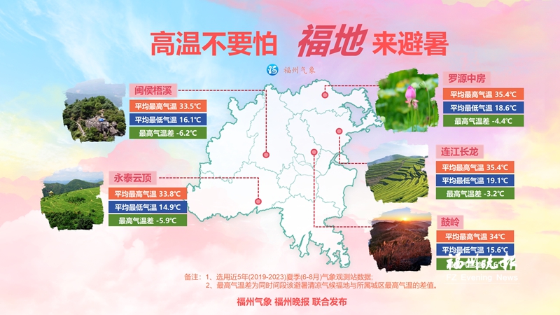 有山 五大避暑清涼福地 在2024年福州避暑地圖上,鼓嶺、永泰縣云頂景區(qū)、羅源縣中房鎮(zhèn)、閩侯縣洋里鄉(xiāng)梧溪村、連江縣長龍鎮(zhèn)在列。 鼓嶺,是不少福州人的避暑首選。24日,記者自駕來到鼓嶺旅游度假區(qū)的長田花溪谷,只見朵朵嬌艷的繡球花綻放,讓人宛如來到了“莫奈的花園”?!拔沂歉V萑?,基本每年都來鼓嶺避暑,鼓嶺的涼快是出了名的。這里拍照不熱,感覺像是來到天然的空調(diào)房?!睌z影愛好者鄧先生告訴記者。 鼓嶺距市中心約12公里,平均海拔750米至800米,高山阻隔了海上吹來的濕潤季風(fēng),夏季最高氣溫30℃左右,兼具“清風(fēng)、薄霧、柳杉、古厝”四大特色自然、人文景觀。早在20世紀(jì)初,這里就成了外國人的避暑勝地。如今,它還是國家級旅游度假區(qū)、國家生態(tài)旅游示范區(qū)、“清新福建·氣候福地”避暑清涼福地。 永泰縣云頂景區(qū),被譽(yù)為“云端上的香格里拉”,是國家4A級旅游景區(qū)、國家生態(tài)旅游示范區(qū),富含氧離子,以云海景觀聞名。 羅源縣中房鎮(zhèn),是省級生態(tài)鎮(zhèn),夏季平均氣溫僅24.7℃,擁有藍(lán)如寶石的下大洋水庫、氣勢磅礴的百丈瀑布、奇石幽洞的鳳凰山等景觀。 閩侯縣洋里鄉(xiāng)梧溪村,有著濃郁的田園風(fēng)光,年平均氣溫18℃左右,村內(nèi)溪流潺潺,古寨、古道、古樹、古坊相映成趣。 連江縣長龍鎮(zhèn),擁有萬畝茶園,素有“云上茶鄉(xiāng)”美譽(yù),常年平均氣溫16℃~ 17℃,可將羅源灣、可門港美景一覽無遺。 那么,這份地圖是如何出爐的?福州市氣象服務(wù)中心主任王宇飛告訴記者,近年來,經(jīng)地方政府推薦,省文旅和氣象部門綜合考量城市及景區(qū)的空氣質(zhì)量、水質(zhì)情況、森林覆蓋率、負(fù)氧離子濃度、旅游資源及配套等多項因素,福州上述五個地點先后被認(rèn)定為“清新福建·氣候福地”避暑清涼福地。 王宇飛介紹,氣象部門選用近5年(2019-2023)夏季(6月至8月)氣象觀測站數(shù)據(jù),并統(tǒng)計避暑清涼福地及所屬轄區(qū)城區(qū)的氣溫數(shù)據(jù),從而繪制出2024年福州避暑地圖。 “福州旅游資源豐富。在避暑地圖上,我們標(biāo)注了五處避暑清涼福地的夏季平均最高氣溫和最低氣溫,以及它們與所在轄區(qū)城區(qū)氣溫的差值,并配上了美圖,旨在為市民提供氣象專業(yè)方面的‘盛夏納涼指南’?!蓖跤铒w表示。