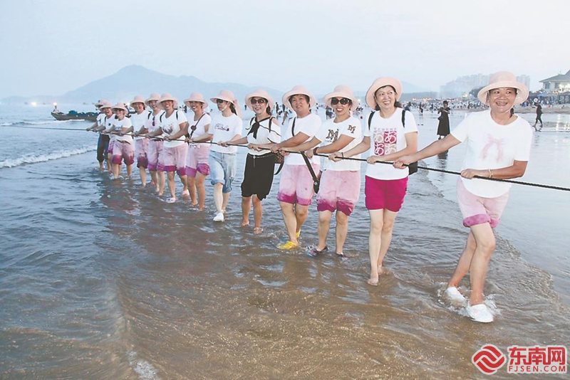 24日傍晚,游客參與東山漁民拉山網(wǎng)捕魚活動。謝漢杰 攝