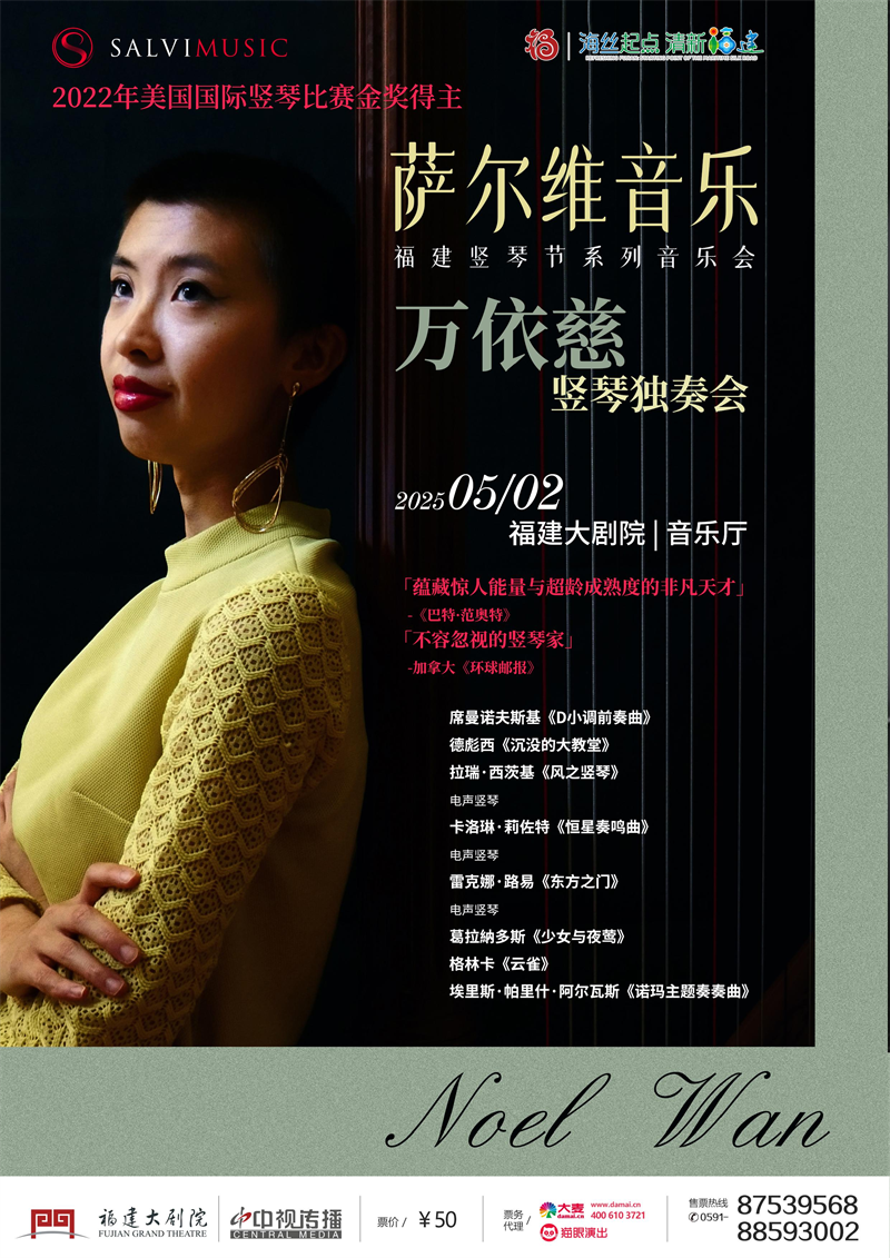 名稱:薩爾維音樂(lè)福建豎琴節(jié)——豎琴獨(dú)奏音樂(lè)會(huì) 時(shí)間:5月1日-3日 20:00 地點(diǎn):福建大劇院音樂(lè)廳 主辦單位:薩爾維音樂(lè)、福建大劇院、福建藝術(shù)職業(yè)教育學(xué)會(huì)豎琴專業(yè)委員會(huì)