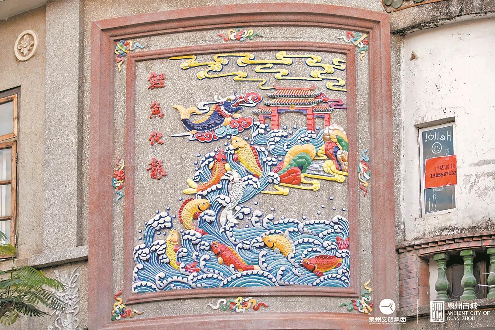 在工藝上,剪瓷雕大約分為四種:平雕、立體雕、疊雕、半浮雕。平雕著重于構(gòu)圖,一般用于近景;半浮雕用于墻面為其添色增彩;疊雕多是屋頂?shù)淖攉F飛禽與花卉樹木;立體雕難度最大,多用于古裝戲曲人物。 剛剛改造完工的中山南路段,剪瓷雕有不少花卉圖案,嫣紅碎瓷做花瓣,青色殘片當(dāng)枝葉,陽光一照,整朵花會發(fā)光。 灰塑 轉(zhuǎn)角遇見“祈福聯(lián)盟”