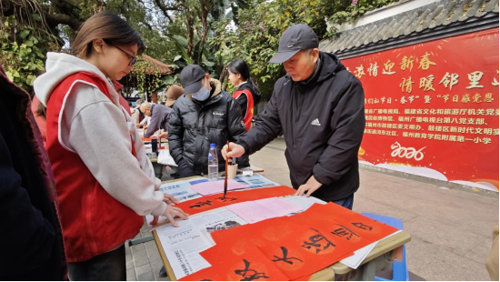 新春將至,年味漸濃。為傳承和弘揚(yáng)中華優(yōu)秀傳統(tǒng)文化,讓社區(qū)居民在濃厚的文化氛圍中感受新春的溫暖與祝福,2026年1月29日,福建省文化和旅游廳機(jī)關(guān)黨委聯(lián)合福建省廣播電視局、福州市鼓樓區(qū)河?xùn)|社區(qū)、福建民俗博物館、福州廣播電視臺(tái)第八黨支部、福州教育學(xué)院附屬第一小學(xué)共同開展“墨香濃情迎新春 情暖鄰里送祝?!薄?026年“我們的節(jié)日·春節(jié)”暨“節(jié)日感黨恩 共話新時(shí)代”主題活動(dòng)。轄區(qū)居民、企業(yè)人才代表、市民代表、轄區(qū)臺(tái)胞等共同參加。