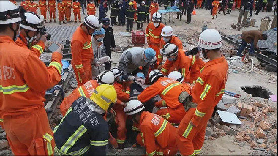 安撫鼓勵獲救人員 由于被困男性胸部被卡,救援難度較大,救援人員一邊對其安撫和輸氧,一邊同步破拆壓在其胸口的水泥板,10多分鐘后將其成功救出?!爸x謝你們給了我們一家重生的機會”!事后了解到他們?yōu)橐患宜目?,指?zhàn)員科學(xué)、及時救援讓他們一家化險為夷。此時離救援工作展開不到2個小時,已有6名被困人員成功得救。 連續(xù)奮戰(zhàn)——4小時救出 15人 為進一步提高救援效率和救援進度,指揮部通過詢問被救人員,并結(jié)合搜救犬、生命探測儀搜索情況,基本明確了剩余被困人員的位置,并按區(qū)域劃分出救援網(wǎng)格,采取人歇裝備不歇,分批輪流作戰(zhàn)的方法。