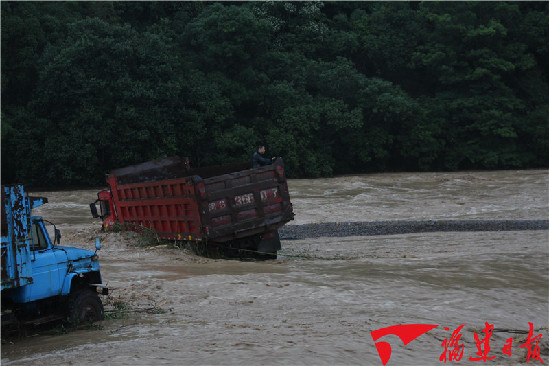 在現(xiàn)場,采沙廠內(nèi)原本用來開采砂石的小河已經(jīng)水位猛漲,洪水不斷翻滾,一輛紅色貨車和一輛藍(lán)色貨車停在河中央。通過觀察,消防指戰(zhàn)員看到藍(lán)色貨車內(nèi)沒有人員被困,而在紅色貨車的車廂位置,一名約40歲左右的男性雙手緊緊抓住車廂尾部擋板,等待救援。此時,河水已經(jīng)漫過了貨車的輪胎,被困男子顯得比較虛弱。