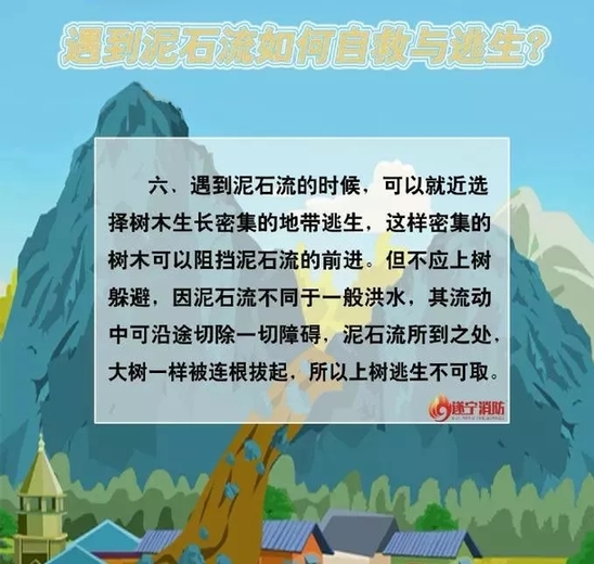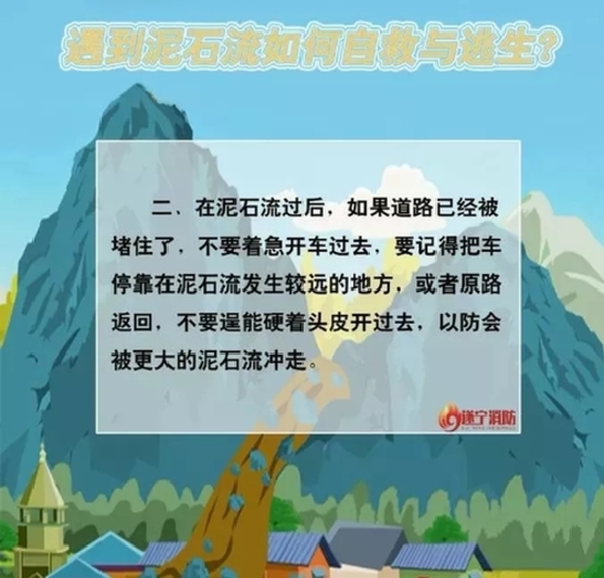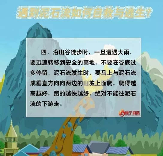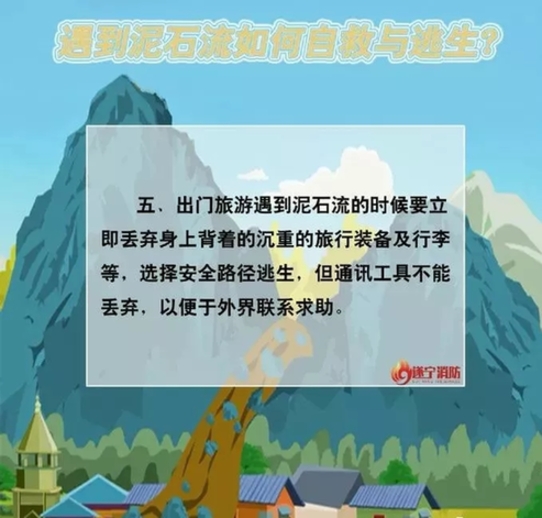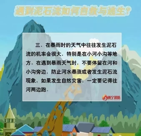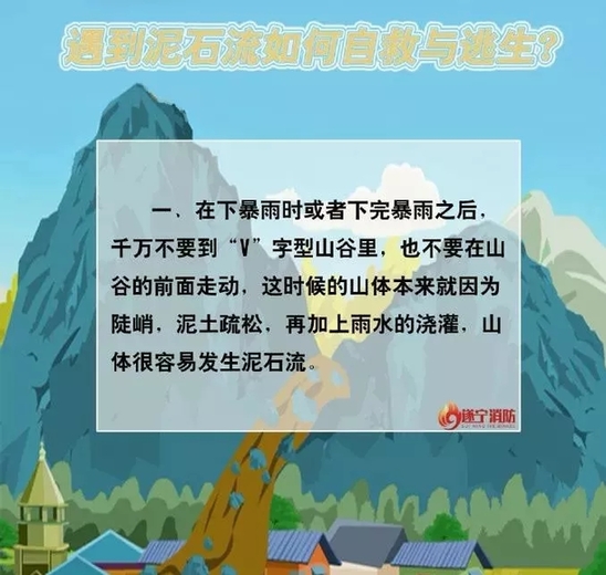 ![]() 夏季,多發(fā)暴雨洪澇災(zāi)害,山區(qū)有發(fā)生山體滑坡、泥石流等潛在危險(xiǎn),那么滑坡泥石流的危害到底有多大,在遇到突發(fā)險(xiǎn)情的時(shí)候我們又該如何應(yīng)對呢?下面就和小編一起來學(xué)習(xí)一下吧! No.1 什么是泥石流? 夏季雨水多的時(shí)候,在山區(qū)地帶極易出現(xiàn)土質(zhì)松動(dòng),從而造成泥石流,泥石流是指一種突然爆發(fā)的含有大量泥砂、石塊的特殊洪流。 No.2 險(xiǎn)情先知道! 在險(xiǎn)情發(fā)生之前,我們可以根據(jù)一些跡象來進(jìn)行簡單的預(yù)先判斷,對可能發(fā)生災(zāi)害的地方,一定要遠(yuǎn)離,以免受到不必要的傷害。 ![]() ![]() ![]() ![]() ![]() ![]() ![]() ??? (本文綜合自:新京報(bào)、中國氣象局、遂寧消防、應(yīng)急知事) |