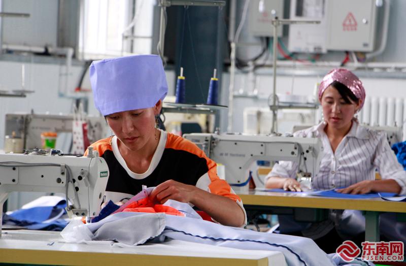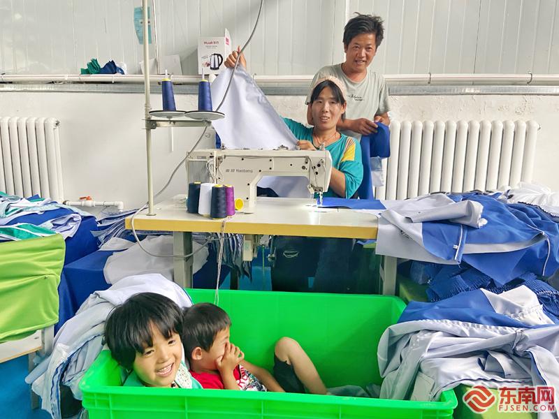 在福馬扶貧車間內工作的當?shù)卮迕瘛?東南記者 顏財斌 攝 2018年,占地面積150畝的頭營鎮(zhèn)福馬村建成,這是寧夏“十三五”易地扶貧搬遷就近安置點,頭營鎮(zhèn)坪樂等東部山區(qū)4個村148戶514人搬遷至此。為了確保移民群眾“搬得出、穩(wěn)得住、逐步能致富”,移民村建設中重點抓好基礎設施、產業(yè)發(fā)展、管理服務等工作。2018-2020年共投入援寧資金348萬元支持福馬村建設。 8月25日下午,當記者走進位于寧夏固原市原州區(qū)頭營鎮(zhèn)福馬村的扶貧車間時,便可聽見針織車滴滴答答響著不停,十多名工人們熟練地轉動著手中的縫紉布,正忙碌著趕制新學年的校服訂單。而在車間的角落,幾個小孩子快樂地玩耍,等待著父母親的下班。 海蘭是今年6月份剛剛進入車間工作的村民,在她看來,家門口就業(yè)比遠赴外地打工更加方便實在,“現(xiàn)在我從家里走路10分鐘就可以到車間上班,時間靈活,也可以照顧家庭”。與海蘭有著一樣想法的還有車間工人馬志梅。馬志梅是一名新員工,不久前與丈夫一起來到車間里工作,兩個人對面而坐,相互配合。馬志梅告訴記者,丈夫是車間的老員工,技術上比她好,所以很多時候可以教她如何做。然而,最讓馬志梅喜歡這項工作的原因是,不僅可以賺錢貼補家用,還可以方便照顧小孩。 記者注意到,就在馬志梅和丈夫的工位旁邊,他們的兩個小孩子正在一個塑料大桶里玩耍,如果工作比較忙,兩個聰明的小孩子還會給爸爸媽媽打個下手?!拔壹依镄『⒈容^多,因為需要有更多的時間來照顧小孩,而這個在家門口的工作剛好很適合我的家庭情況?!瘪R志梅說,除了照顧小孩外,農忙的時候全家還要騰出時間做耕地,因此這個車間靈活的工作時間也很適合她。